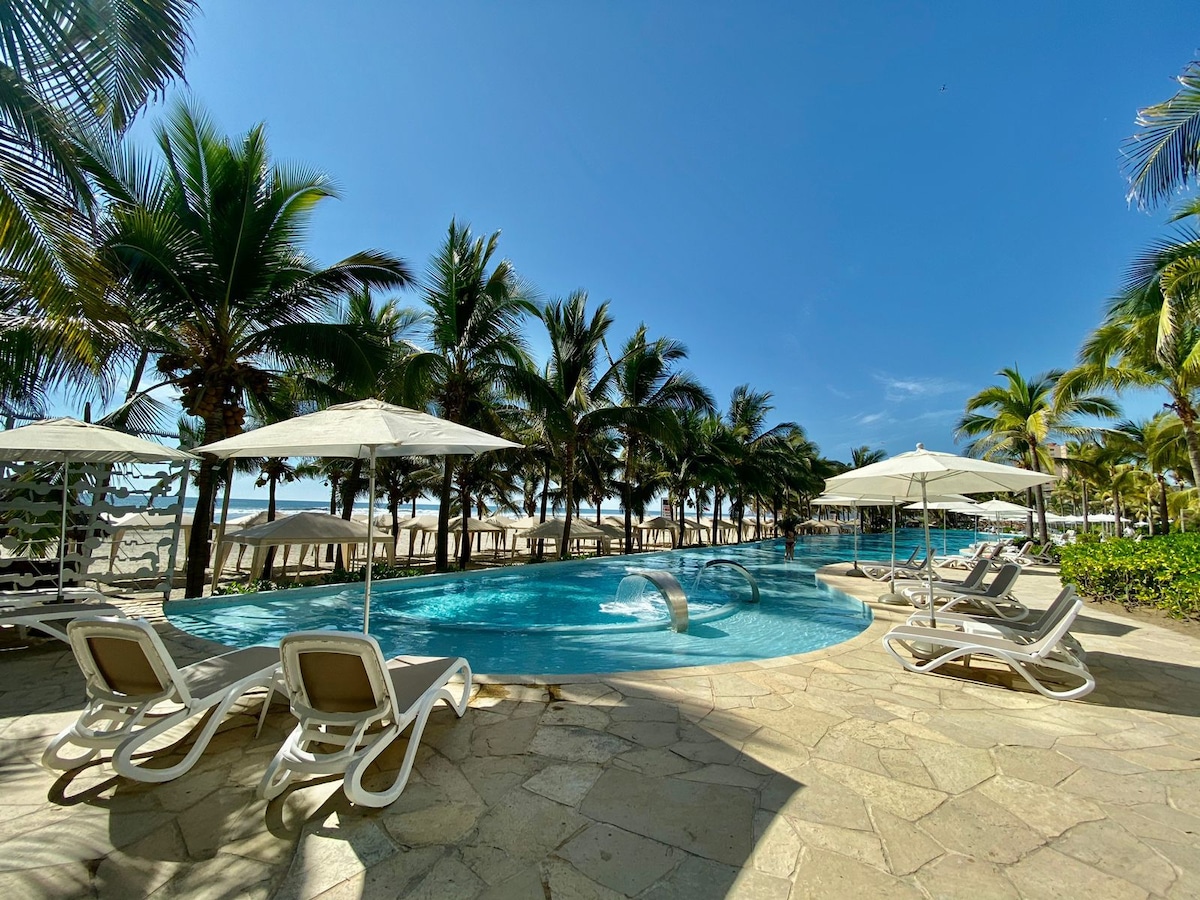 ¡Reabrimos, te esperamos con mucho gusto! Disfruta nuestra alberca y acceso privado a la playa. ¡Perfecto para vacaciones o home office! Balcón con vista increíble a la bahía. WiFi en el departamento y zonas comunes. Pantalla Smart lista para Netflix, Prime Video, etc. Espacio de trabajo en la habitación para leer o trabajar con tu laptop/tablet. El departamento está en excelentes condiciones. Aunque el condominio está en remodelación por el huracán Otis, todo es funcional.
