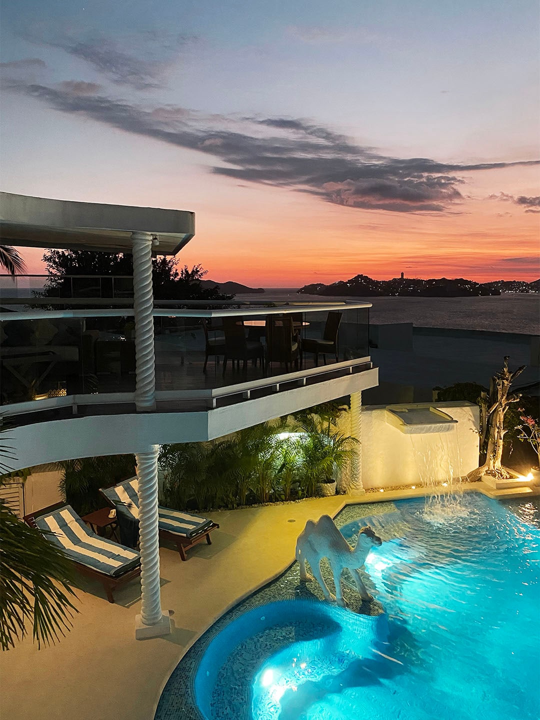 Lujoso, moderno y amplio departamento al pie del mar con vista espectacular de la bahía. El condominio tiene acceso directo a la playa, una zona de alberca con jardin, wifi gratuito en áreas comunes, sundeck y playa privada ! Ambiente relajado y familiar, seguridad las 24h y un personal muy amable y eficiente. Excelente ubicación, a un paso del club de golf, muchas opciones de restaurantes y supermercado cercanos. No se aceptan mascotas.
