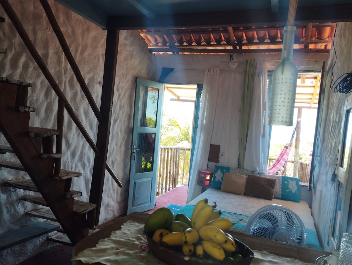 Chalé muito bem localizado: próximo as dunas do pôr do sol, à 400 m da praia e à 5 minutos a pé da rua principal. Bastante arejado e tranquilo, o chalé é ideal para casais ou para uma família pequena que queira aproveitar da natureza com muito charme, conforto e tranquilidade. O chalé tem sua entrada independente mas divide terreno com o chalé do lado que também tem sua própria entrada .