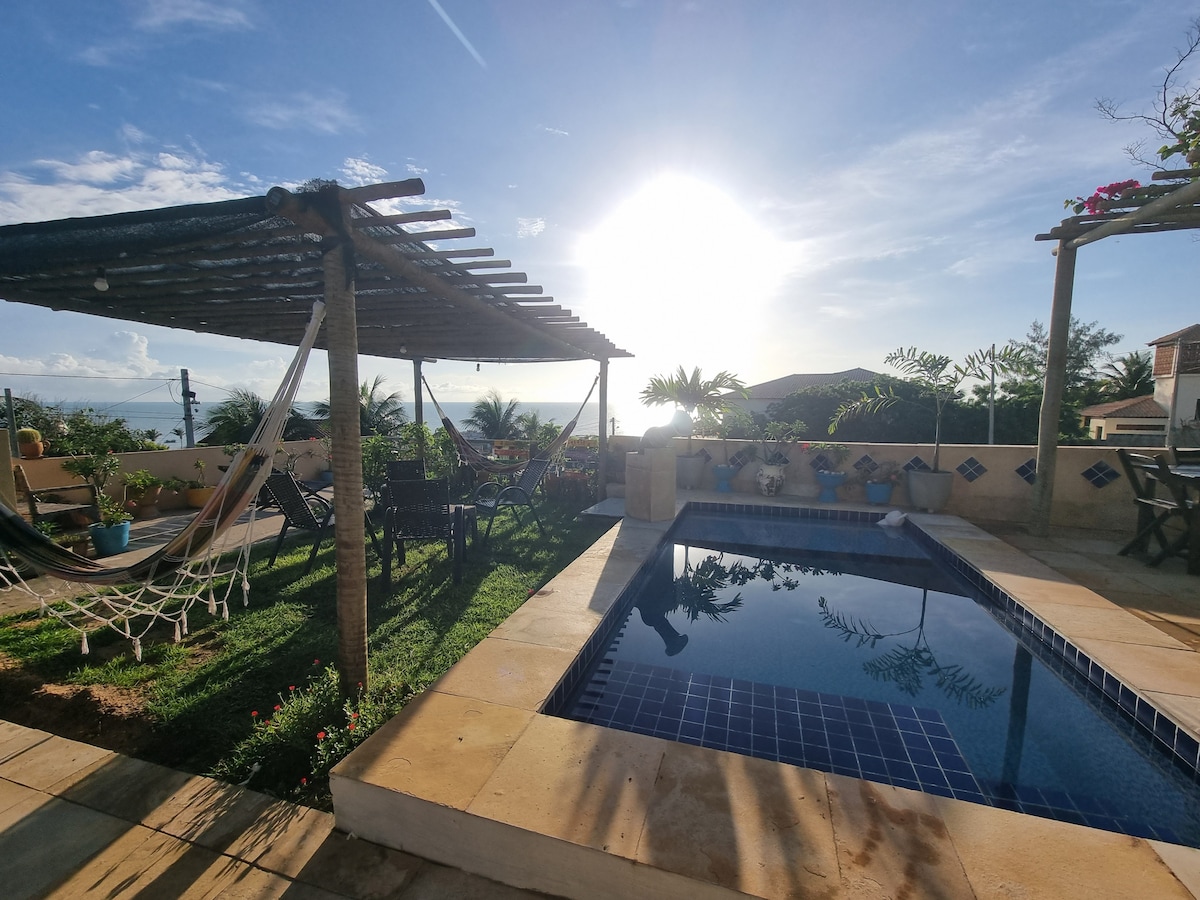 Somos uma hospedagem familiar. Cada chalé consegue acomodar confortavelmente uma família pequena, dispondo de uma área de serviço com vista para o mar e cosinha completa. Tanto o quarto quanto a área de serviço contam com armadores e espaços extras.