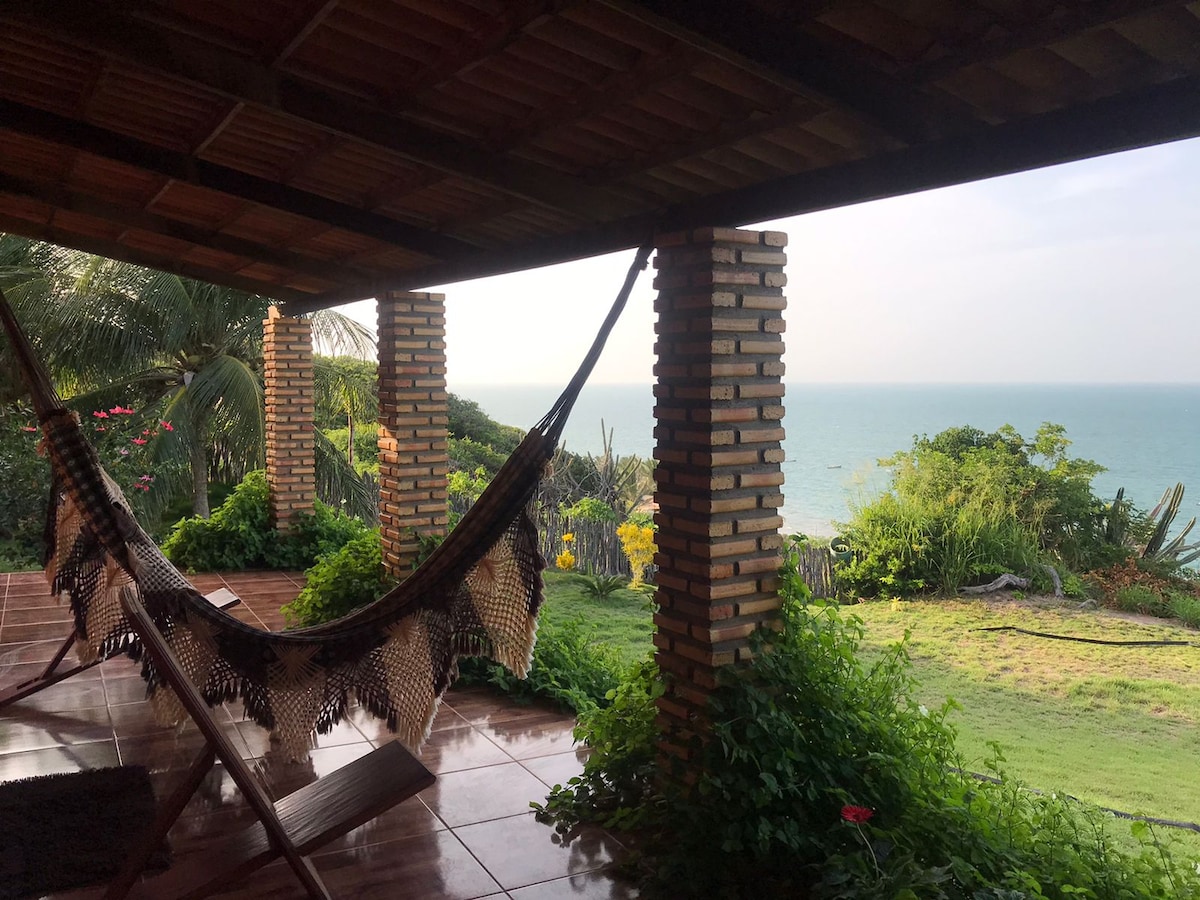 We are proudly renting our holiday home in Praia de Redonda, Icapui. Located, right above the beach, with a spectacular panoramic ocean view. A quiet location in direct contact with nature, to relax and recharge your batteries. Our house lays on huge 530 m² garden with palms, fruit trees and hammocks waiting for you. Only a 10 minute walk from the beach down the hill. We provide fresh bed linen, towels, a fully equipped kitchen and private parking area for your car.