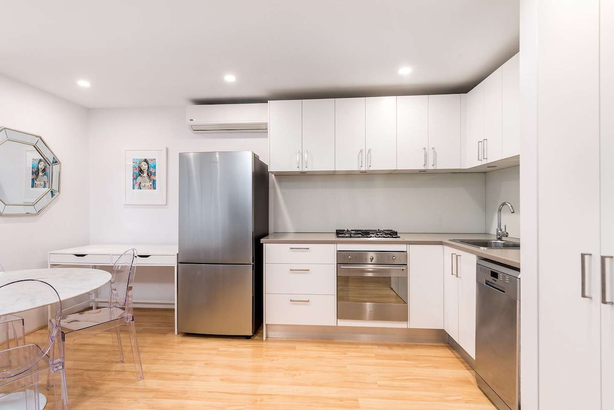 A perfectly situated 1-bedroom apartment with a large courtyard, moments from everything yet whisper-quiet at the rear of a boutique building. Equipped with everything you'd expect in a serviced apartment: luxury Leif toiletries, weekly cleaning, professionally cleaned linen and towels, all kitchen utensils, Nespresso machine, and onsite laundry. A perfect base for your Sydney visit, across from a lovely park and just 2 minutes' walk to the Sydney Metro. Features AC, heating, Wi-Fi and smart TV