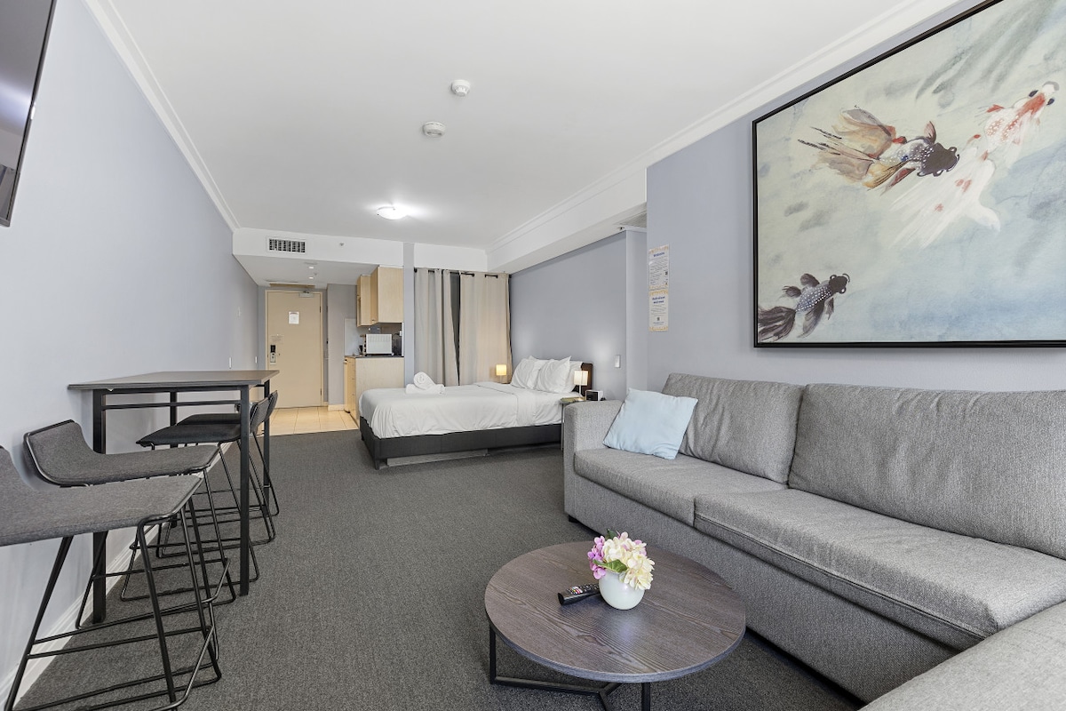 Nestled within a prestigious hotel overlooking Hyde Park, our 1 bedroom residence offers an unmatched urban experience. Dive into relaxation with our rooftop pool, or indulge in therapeutic massages on Level 2. Step outside and you’re moments away from vibrant bars and eateries. Plus, savour gourmet delights at the exquisite Thai restaurant right on the ground floor. A blend of luxury, convenience, and culinary adventure awaits in our 1 bedroom entertainment hub in Darlinghurst.