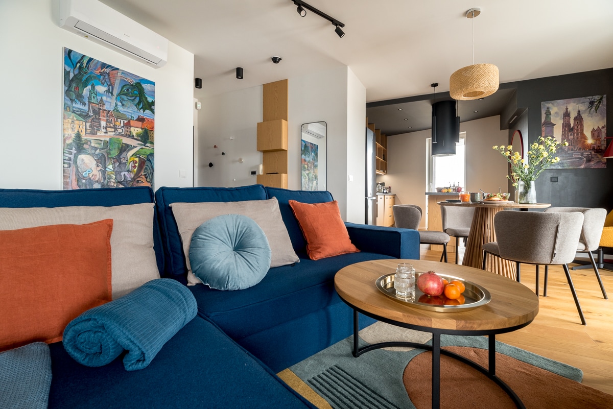 View lovely historic Old Town buildings from this 40sqm contemporary apartment located on Wielopole 17 street, perfectly between the Main Square and Jewish Quarter. Revive in air-conditioned interior with modern furnishings, and natural wood flooring. Entertain with the Smart TV. The apartment consists of: — living room with a sofa bed and dining area, — separate bedroom with queen size bed, — fully equipped kitchen, — central AC, — bathroom with a large shower, — fast WiFi.