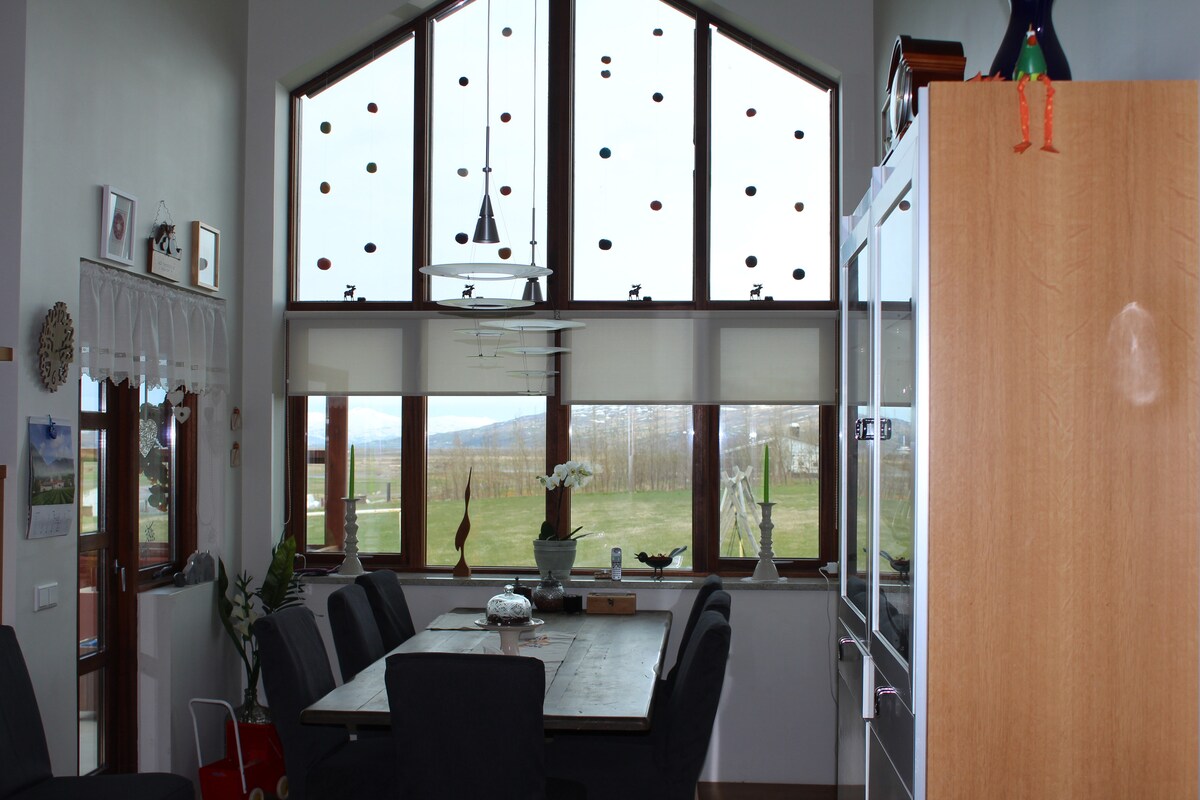 My property is beautiful house in the country side with a great mountain view and as well a view over the ocean. This is a home stay, I live in the house with my husband. I am renting out four rooms. Location is very close to Akureyri (9 km) and good for a day trips f.x. to Mývatn, Dettifoss, and Húsavík. In the neigbourhood there is a golf-course, swimming pool, horse rental, hiking trails and vegan diner. You can have access to kitchen for light meals and heat something in the oven.