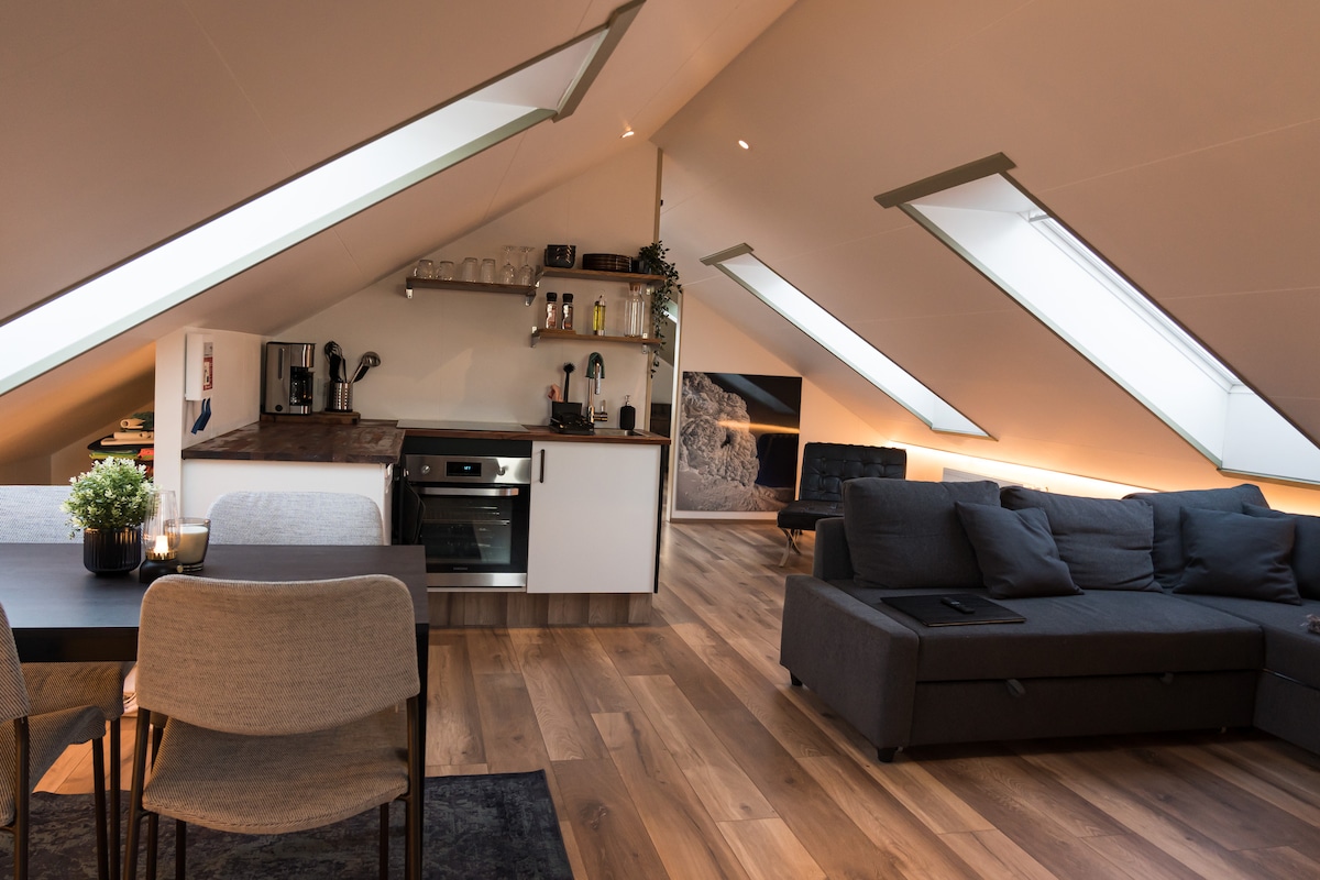 Enjoy a peaceful, spacious loft located only 4 km. from downtown Reykjavik, nestled in Seltjarnarnes. Walk to nearby essentials- grocery, restaurants, bakery, pharmacy, cafes and a geothermal pool. Wake up to mountain views and stroll along the coast for a true Iceland experience. Grótta Lighthouse, a prime Aurora vieweing spot, is also nearby. Your perfect home away from home awaits!