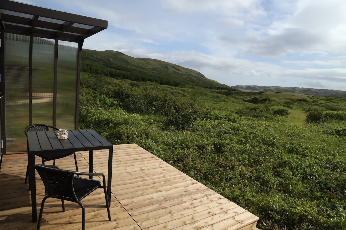 This getaway is very unique and secluded. It has spectacular panorama mountain view over two of Iceland's most famous volcanos and fantastic northern lights sightings. The house is cozy with lots of windows for enjoying the view. Sleeping space for 4 people, a comfortable full size bed and a luxury sofa bed. This place has a lot of character and Icelandic artwork on the walls also powerful wi-fi and a smart tv. Private washing room with washer and dryer.