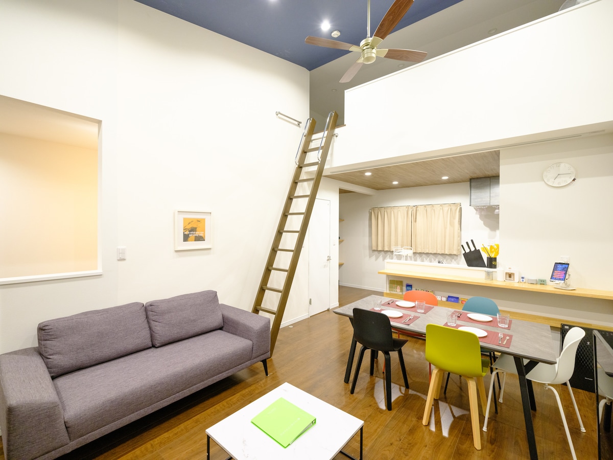 【Shida House A棟】 2021年新築 80㎡ / 2〜6名 / リビングダイニング、一部吹抜けシーリングファン / 寝室×2(両室ロフト付き)/無料駐車場3台/外シャワー/玄関から浴室やサーフボード・ウェット置き場に直結/リビング直結の天然芝の広いお庭と屋根付きウッドデッキ/BBQコンロ完備(炭・トングもご用意しております)/IPv6 WIFI/洗濯乾燥機/自動食器洗い (注:追加ベッドは備え付けの布団のセルフサービスによるセットとなります) オリンピック開催地のサーフスポット志田下ビーチまで徒歩5分、2階ロフト海側から九十九里の太東港を見渡せる見晴らしのいい、自然豊かな環境の一軒家です。リビング直結の南側に面した24㎡の屋根付きウッドデッキで42㎡の南に面した天然芝生の庭を眺めながらバーベキューをお楽しみ頂けます。31㎡のリビングは一部吹き抜けで、シーリングファンと木目の天井がリゾート感を演出しており、夜は九十九里の澄んだ星空を眺めながら仲間やお子様連れ家族で楽しめます。