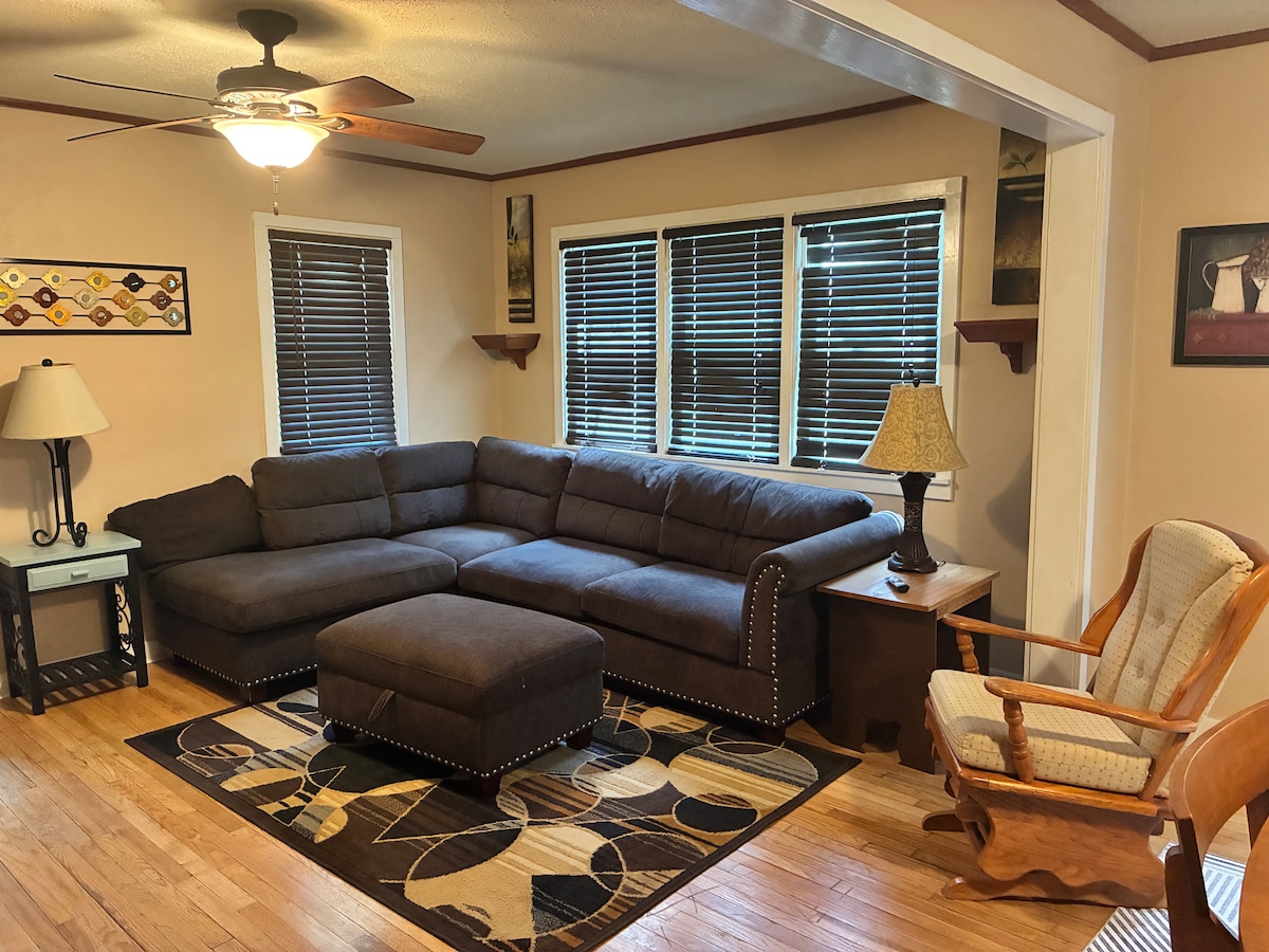 "Our Home" is an out of the way place for the whole family to enjoy. The 1967 ranch style home ground floor apt has 3 bedrooms, each with a queen size bed, full kitchen, laundry with half bath, living room, sunroom, outdoor dining on the deck and a shared patio. "The Home Place" is good for families, reunions, wedding guests, travelers, guests who work remotely, vacation or getaway. Our home is located on a gravel road in rolling hills near corn & soybean fields and concentrated hog farms.