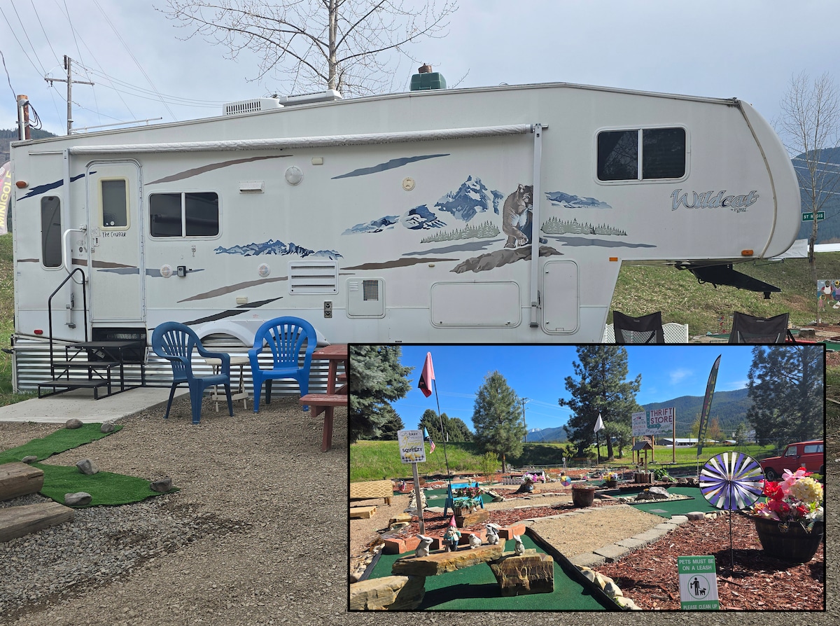 Great for families & fishermen! This memorable experience is anything but ordinary. Enjoy an easy access glamping experience in our cozy COUGAR RV at the best Home-Made MINIGOLF COURSE in Western MT. Located just across the road from the Public Fishing Access/Boat Dock & TRAIN TRACKS. You'll have unlimited access to the 18 hole MINIGOLF course on the property as well as a Hot Tub, SmartTV, fully stocked kitchen, picnic table and BBQ Grill. 3 adults max. PETS are welcome, see below for more info