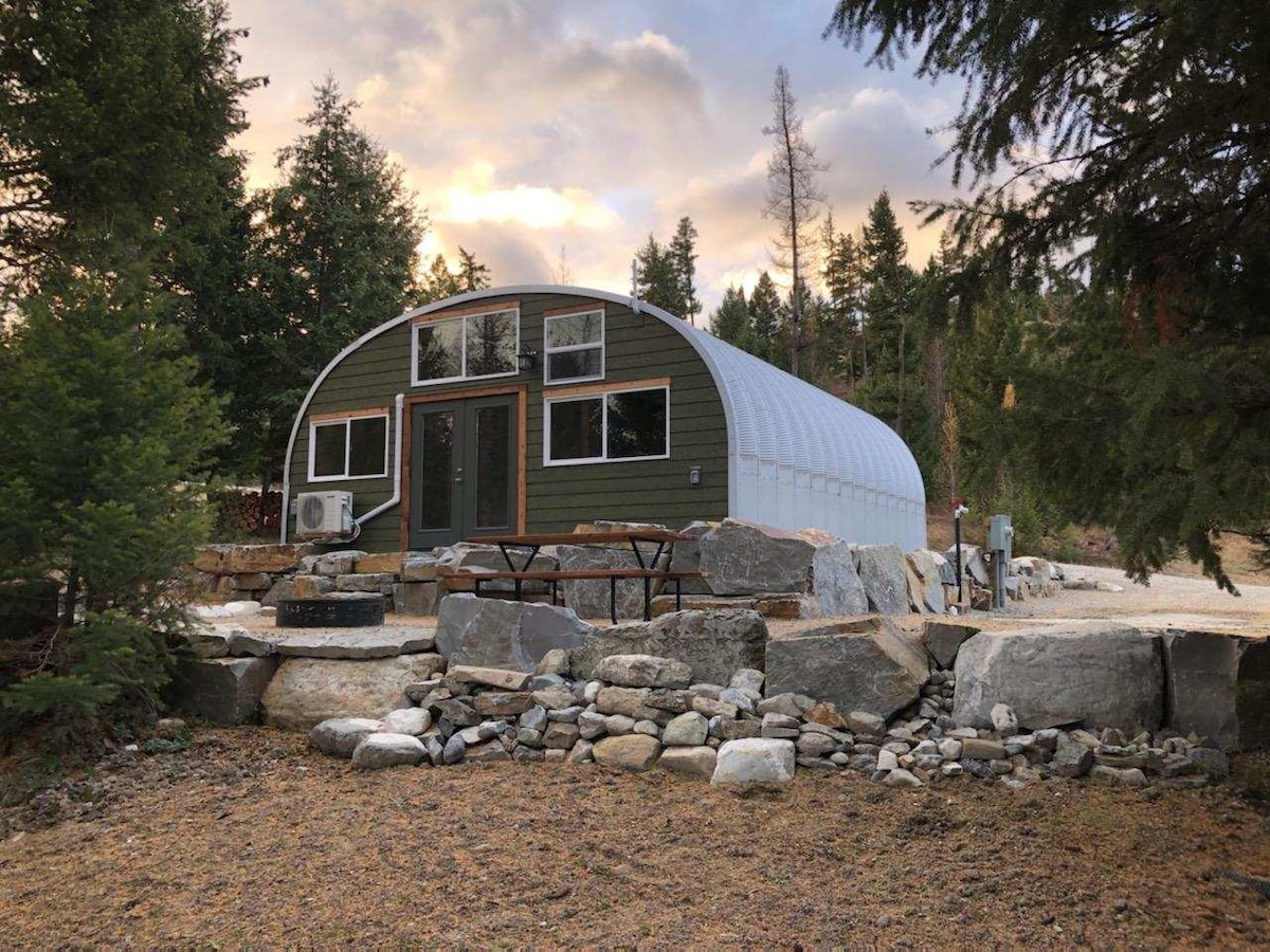 Quonset hut in the woods, mountain views