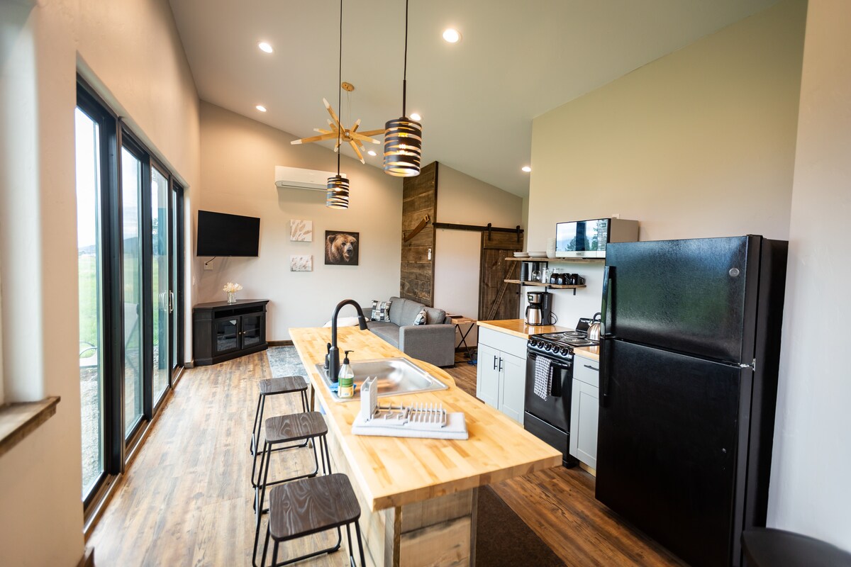 Newly constructed in 05/2022, come stay at our 600sq' Mountain Modern Mini House on 10 acres. With views over looking Kalispell and the Rocky Mountain range, this is the perfect quiet spot to come back to after a long day of adventuring! Located just 20 minutes from the airport, activities are in every direction. Downtown Kalispell is just a quick 10 minute drive, Glacier National Park is a beautiful 45 minute drive, 20 minutes down town Whitefish, 17 minutes to the pristine Flathead Lake.