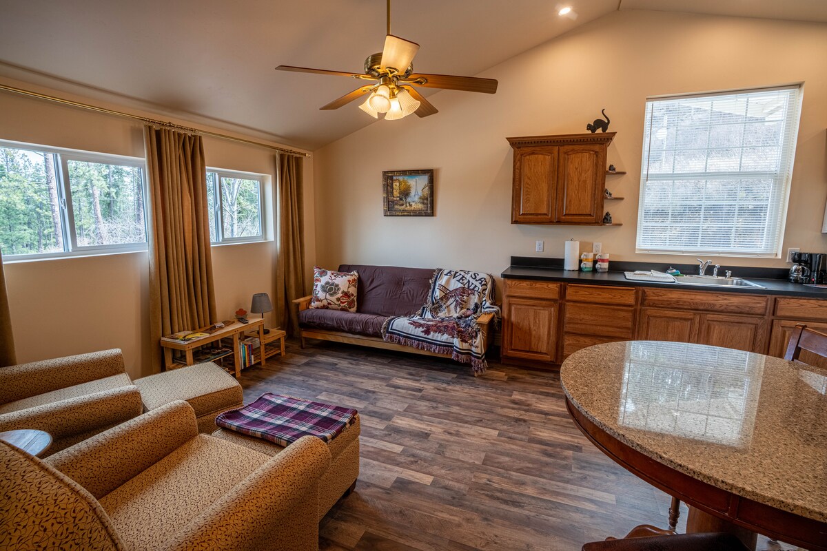 Welcome to our cozy Montana style Studio snuggled in between all that Northwest Montana has to offer! Surround yourself with 10 acres of lush forest with both meadow and mountain views. The location is perfect for those who want to see Glacier National Park, as well as enjoy the conveniences and charm of downtown Whitefish, located less than 10 minutes away. Ideal for both couples and small families. Treat yourself to something very special; come relax and enjoy our slice of Montana paradise.