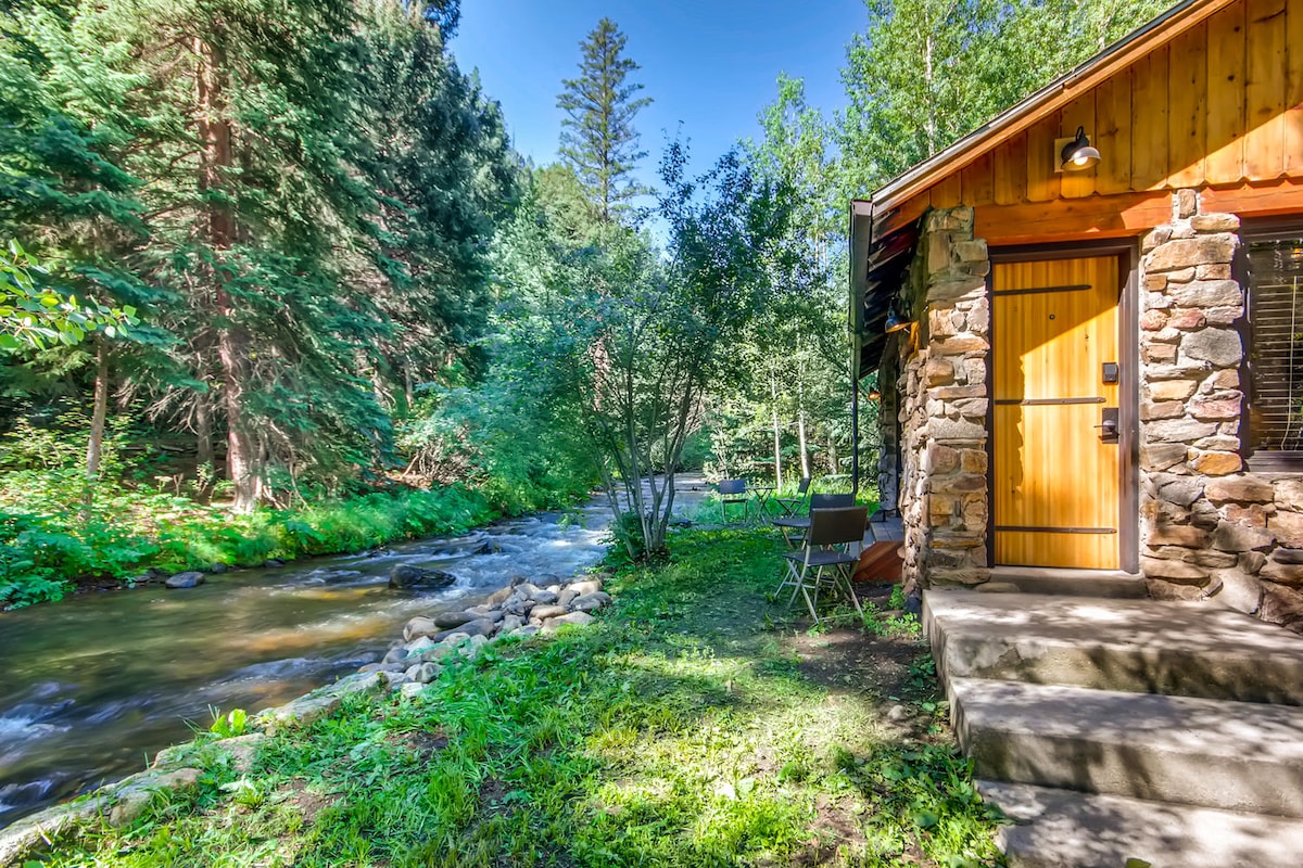 This stylish, waterfront cabin is perfect for a romantic getaway or lone traveler, at Water & Stone Retreat in Idaho Springs Colorado. Stunning mountain views, lush forestry & a bustling creek just off the back patio bring in the peace and tranquility only found in nature. Cozy and inviting with heated bathroom floors, and a gas fireplace. Just 5 minutes from the the historic town of Idaho Springs. 20 mins to ski slopes! 35 mins to downtown Denver! No pets allowed.
