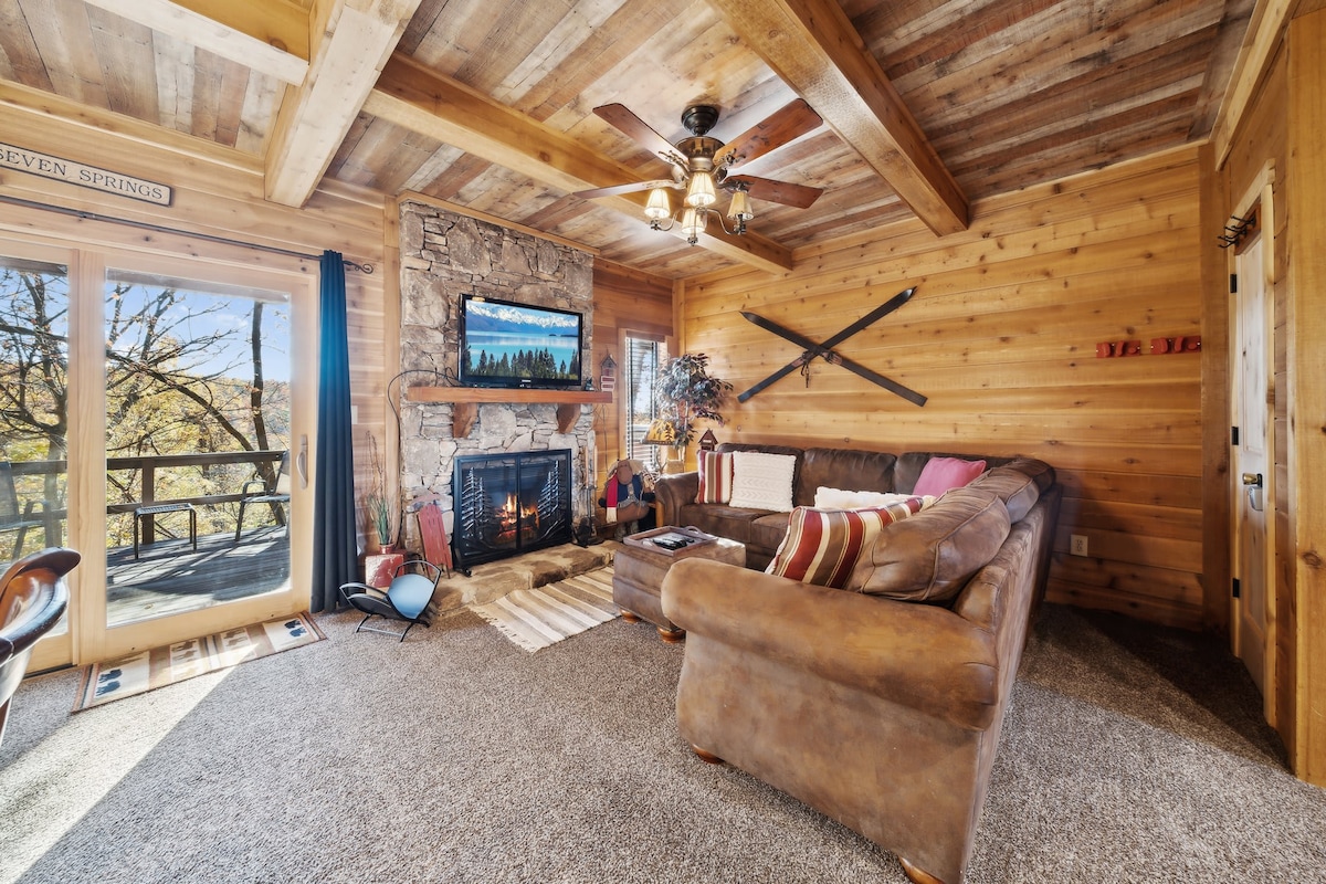 The primary bedroom features a queen-size bed, while the secondary bedroom includes a full-size bed. The living area is equipped with a sleeper sofa for extra sleeping space, and the loft adds two twin mattresses for additional accommodations, ideal for kids. The cabin’s kitchen is equipped with everything you need, including an oven and refrigerator and microwave. Whether you're enjoying time indoors or exploring the outdoors, this cabin offers the perfect balance of comfort and adventure.