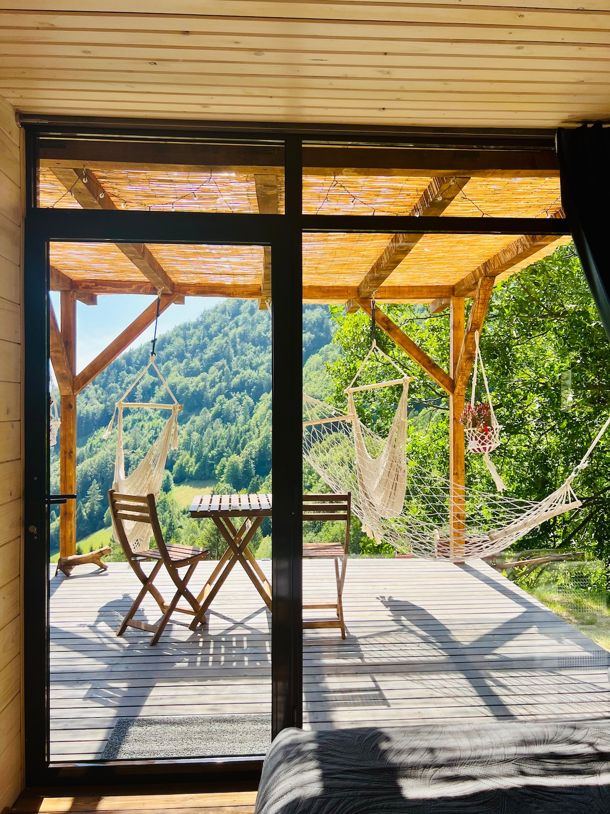 Eco cabin offers you complete exclusiveness in the nature. There is no electricity - solar and akku lights, eco toilete and solarshower (outside). It has gas and wood stove. Rain water-for washing and showering. Water for cooking, electricity, laundry, warm shower, toilet and sauna are at the main property . It is a great place to relax and observe wildlife (deer), to ski (Cerkno), hike, bike (e-mtb for rent), visit Soča valley,... It is not accessible by vehicle - 5 min walk from parking.