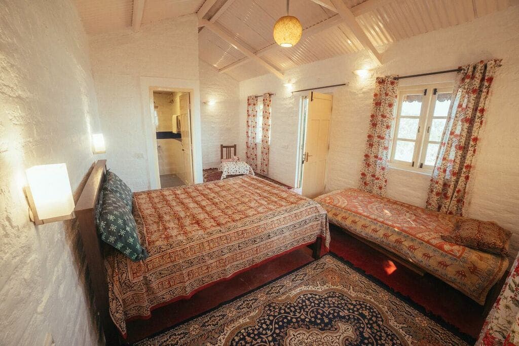 A charming stone-walled bungalow for two, Planters Cottage includes warm interiors and a large bathroom with a bathtub. Step out to a private cabana behind the cottage—perfect for reading or tea. Though 150m from the dining area, it's ideal for couples seeking privacy, views, and comfort with off-grid simplicity.