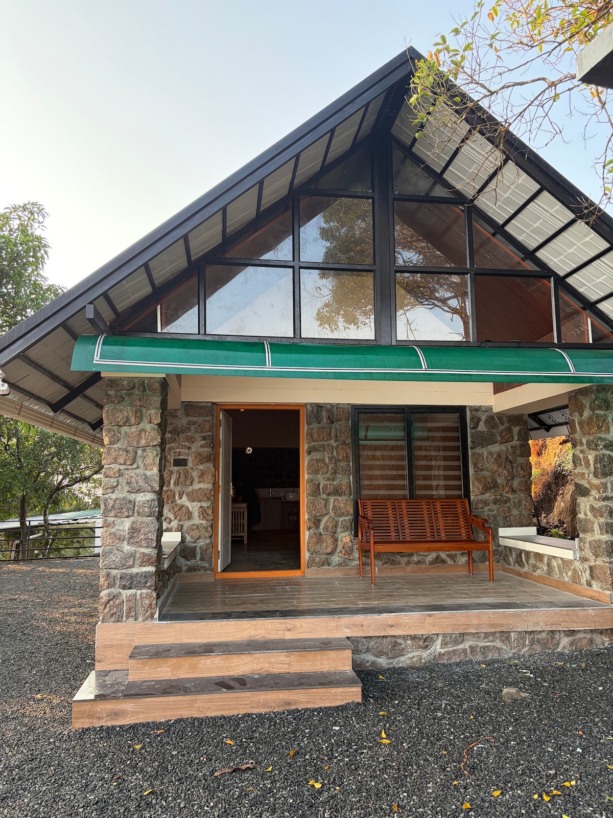 A restored stone cottage at 3,300 ft in Vagamon, Kerala. Off-grid eco retreat on five acres of forest — solar and wind powered, farm-to-table meals by Chef Anoop, no television, and real quiet. The cottage was once a labour shed on a working estate. Original stone walls, comfortable interiors, a verandah overlooking the valley. Not a resort. No pool, no spa. What there is: hornbill song at dawn, bonfires under the Milky Way, and the feeling of being completely off the map.
