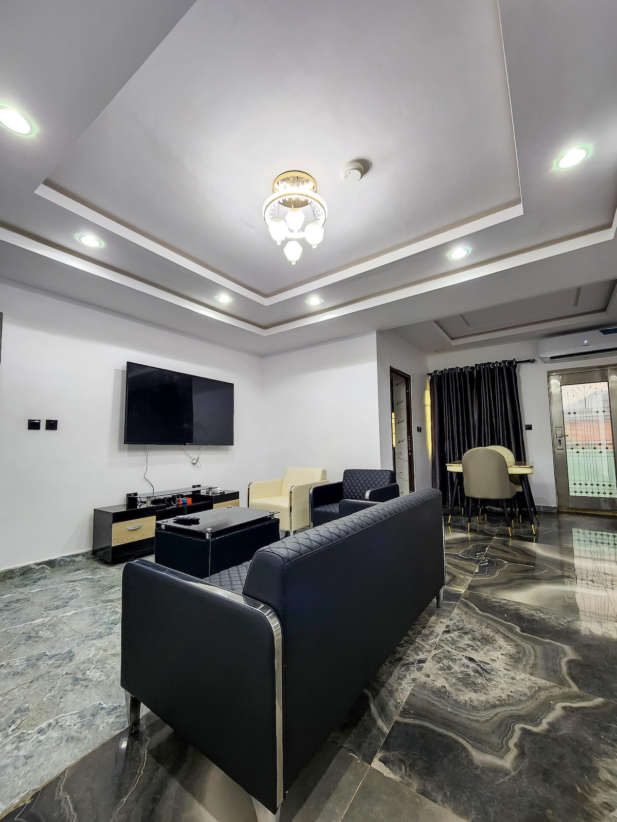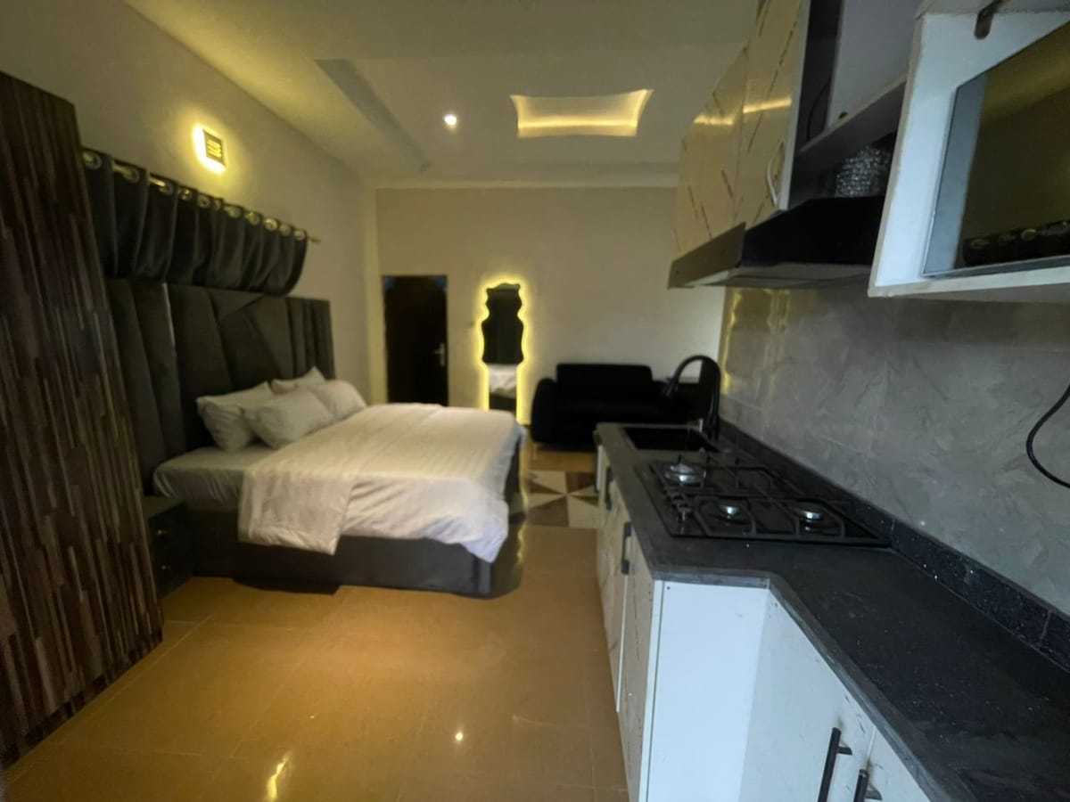 Spacious sitting room and royal ensuite room with Super king bed, modern bathroom and toilet 🚽. Very clean and standard apartment. Royal Pent House gives you all modern comfort beyond your imagination with unlimited high speed WiFi, 43inchSmart Tv in the bedroom and 55inch Smart Tv in the sitting room, YouTube, Netflix, DSTV. Comfortable Sofa, Water heater, Water kettle, Microwave, Cooking gas. Smoke Alarm, Mono dioxide Alarm, 24/7 power. , Cctv, maximum security with 24/7 security personnel