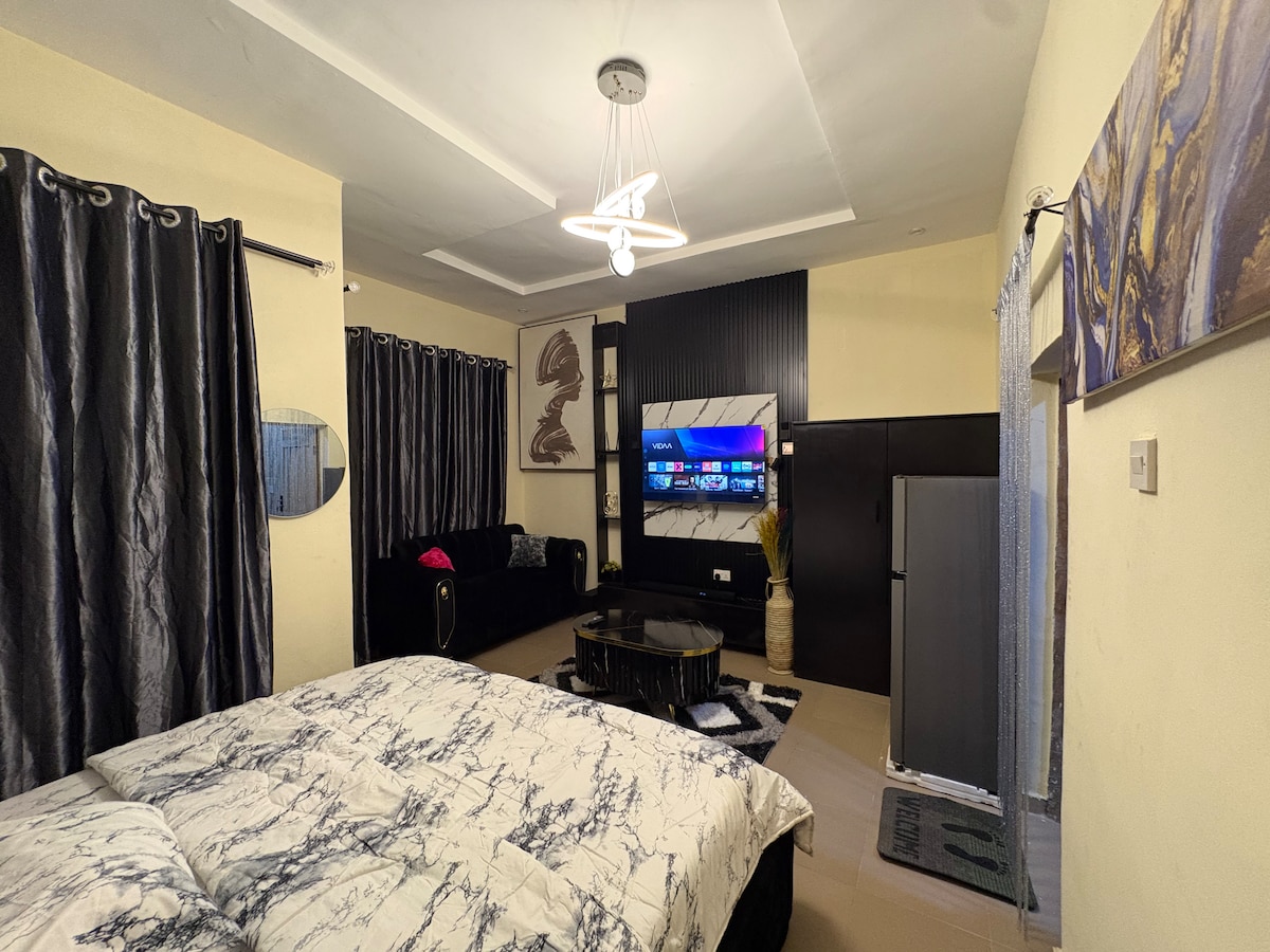 Spacious sitting room and royal ensuite room with Super king bed, modern bathroom and toilet 🚽. Very clean and standard apartment. Royal Pent House gives you all modern comfort beyond your imagination with unlimited high speed WiFi, 43inchSmart Tv in the bedroom and 55inch Smart Tv in the sitting room, YouTube, Netflix, DSTV. Comfortable Sofa, Water heater, Water kettle, Microwave, Cooking gas. Smoke Alarm, Mono dioxide Alarm, 24/7 power. , Cctv, maximum security with 24/7 security personnel
