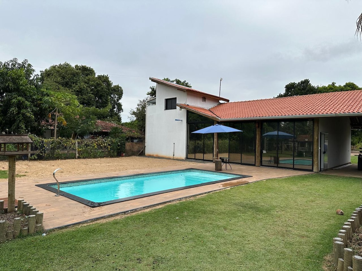 Relaxe com toda a família nesta acomodação tranquila. Um rancho com conforto de casa , a 100 metros do Rio , condomínio bem estruturado e seguro . Venha descansar e ao mesmo tempo se divertir nesse rancho . Espaço todo discreto e reservado para vocês . Muito confortável Temos 2 suítes com ar condicionado, e mais 5 quartos com ventilador de teto .