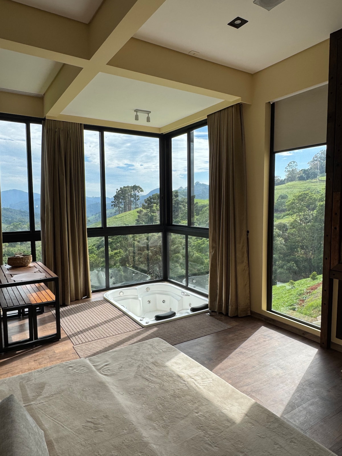 Located on one of the highest mountains in São Bento do Sapucaí, Chalet nas Nuvens (just 20 minutes from downtown São Bento) is a luxurious glass mountain house offering exclusive trails, a farm with animals, hot tub, thousands of fruit trees, a bbq, deck with the most beautiful sunset in the region, a fireplace, fire pits, and magnificent year-round views of the Serra da Mantiqueira Mountains. We like to call it "heaven on earth."