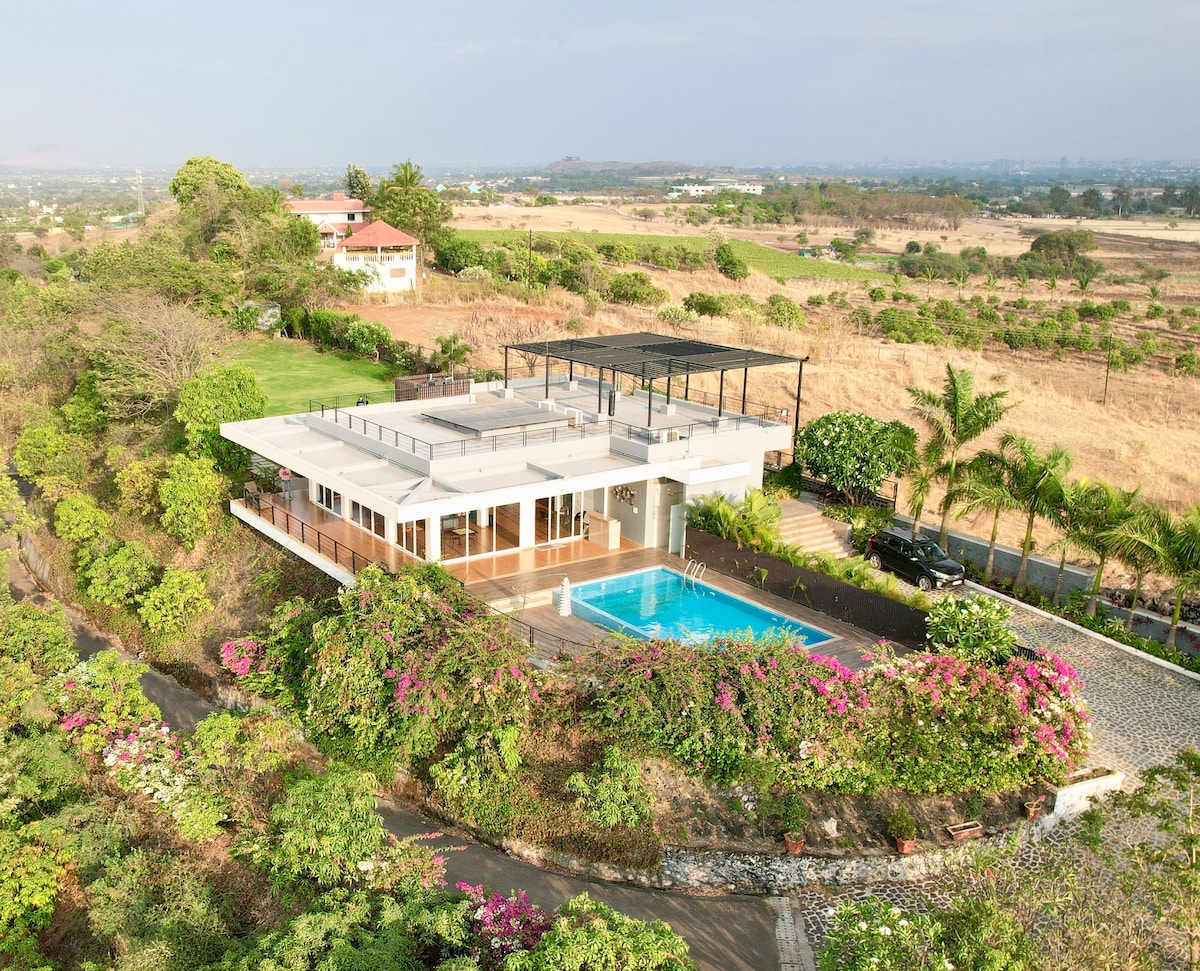 This is a luxurious 5 BHK villa situated amidst the stunning mountains of Sahyadri. The name "Panache" refers to flamboyant style or flair, and this villa certainly embodies that essence. The home boasts of a unique A-shaped design, private infinity pool, Veranda with a cosy lawn, modern interiors & comfortable bedrooms. Whether you're in search of private villas in Igatpuri, family villa in Igatpuri with private pool or the best luxury villas in Igatpuri, this place has it all!
