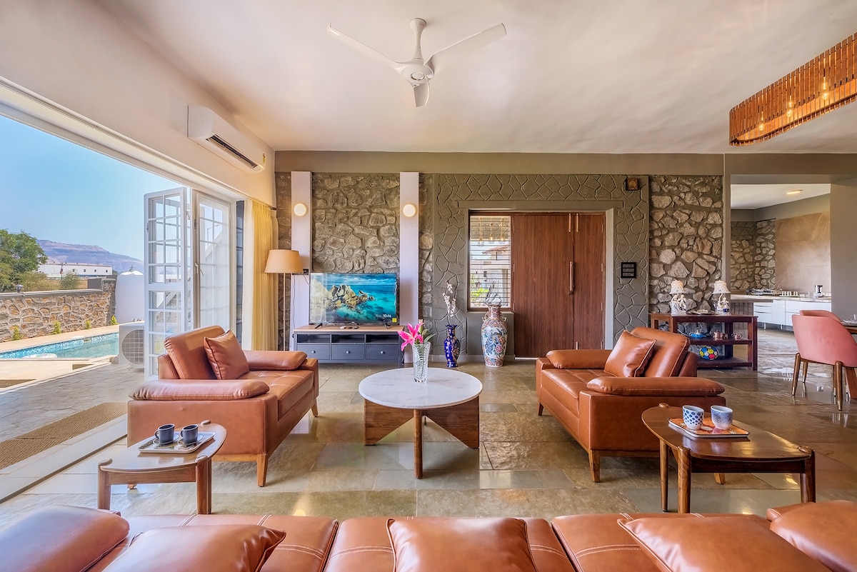 This is a luxurious 5 BHK villa situated amidst the stunning mountains of Sahyadri. The name "Panache" refers to flamboyant style or flair, and this villa certainly embodies that essence. The home boasts of a unique A-shaped design, private infinity pool, Veranda with a cosy lawn, modern interiors & comfortable bedrooms. Whether you're in search of private villas in Igatpuri, family villa in Igatpuri with private pool or the best luxury villas in Igatpuri, this place has it all!