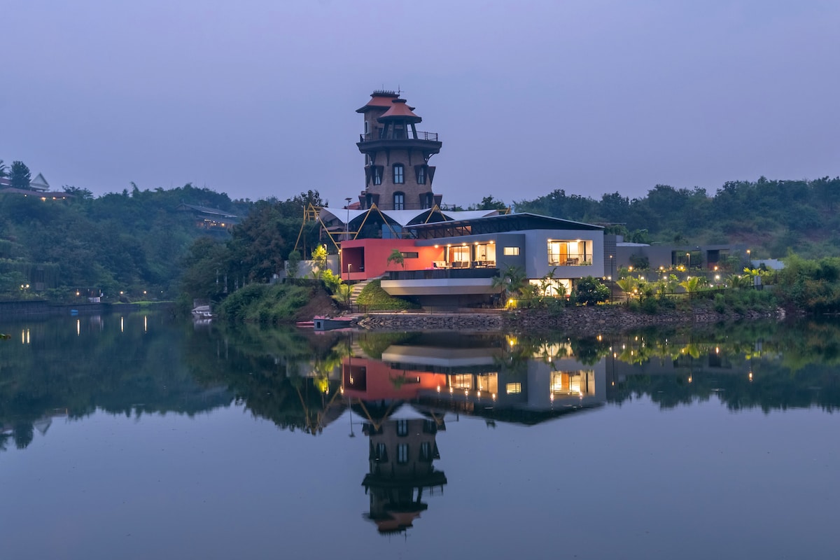 6bhk Wooden villa Perched on the banks of Vaitarna Lake, this architectural masterpiece offers breathtaking views, elegant interiors and a serene escape from the city's hustle. The 42-foot Infinity pool overlooks the Lake. Each six-bedroom opens up to breathtaking views, letting you wake up to nature daily. The villa features an AC living room, a sprawling private lawn, and indoor games including a Pool Table and a Table Tennis Table. In-house staff are making it a complete leisure destination.