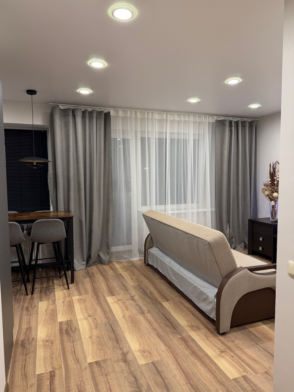 This cozy one-bedroom flat on the first floor is located in the city center and is perfect for 2-4 people. You can feel the countryside atmosphere here, surrounded by a park, with a forest and lake just across the road. The flat features a sunny balcony and is conveniently located near the main city square, shopping center, and grocery stores. It is an ideal place for both business trips and holidays. The apartment is equipped with Wi-Fi, a smart TV, and a washing machine.