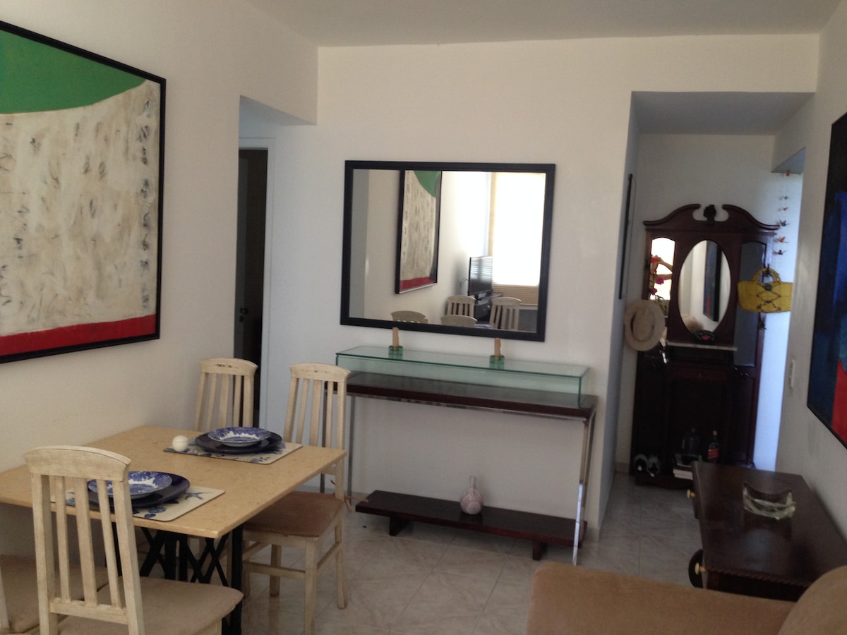 Apartamento muito bem localizado na Barra da Tijuca, com fácil acesso aos restaurantes e shopping centers da região, com 02 quartos, banheiro, lavabo, cozinha, wi-fi, televisão com canais abertos e fechados, duas piscinas (adulto e criança), academia, passeio de balsa, 01 ventilador portátil, transporte de balsa grátis até à praia da reserva e estacionamento para um veículo. Reserve agora. OBS.: NÃO TEMOS AR CONDICIONADO, MAS OS QUARTOS POSSUEM VENTILADORES DE TETO BASTANTE REFRESCANTES.