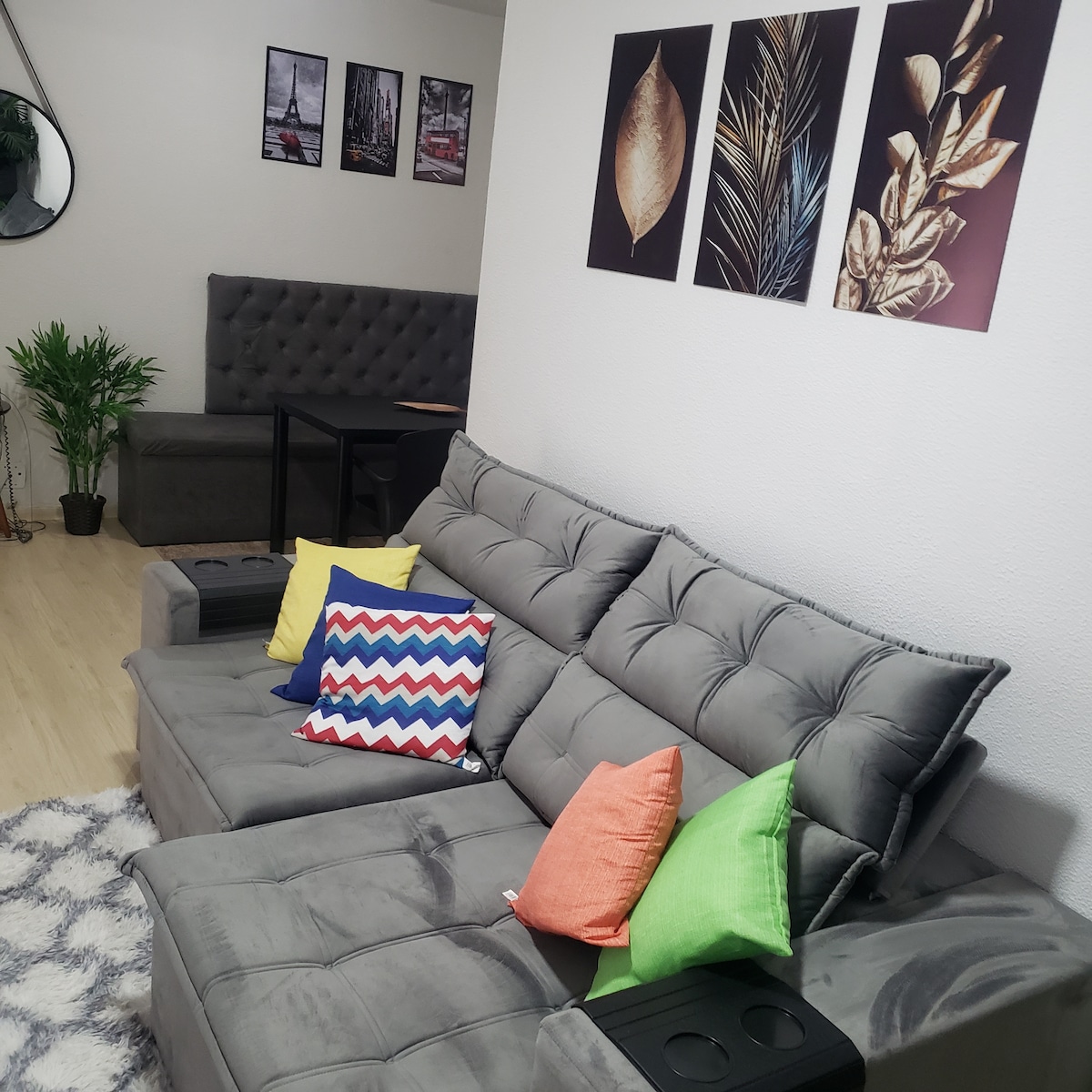 O apartamento conta com dois quartos, um deles suíte, dois banheiros, sala de estar, mesa de jantar e cozinha completa. Totalmente equipado e dispondo de todos os eletrodomésticos e utensílios necessários para uma estada funcional e confortável. O hóspede também poderá contar com internet de 300MB de velocidade, tornando o espaço ideal para quem trabalha. Materiais de limpeza, banho e roupas de cama também são fornecidos.