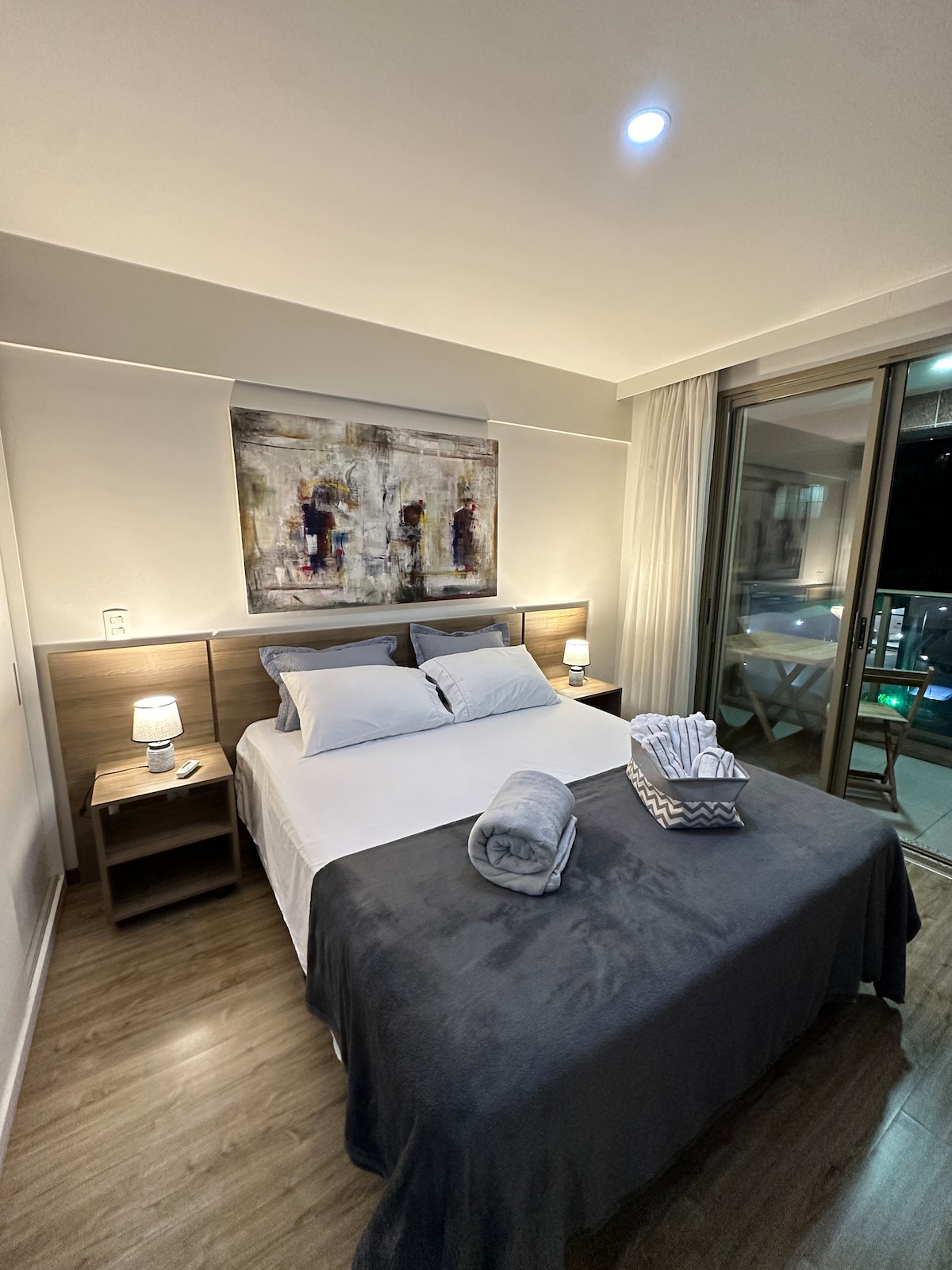 Amplo sala e quarto com varanda, decorado e totalmente equipado: Internet de alta velocidade, Wi-Fi, 2 smart tv's , sala com ventilador de teto e sofá cama, quarto com cama de casal e ar condicionado split, agradavel espaço/escritorio com impressora, cozinha americana com geladeira,fogão, micro ondas, torradeira, liquidificador, máquina de café Nespresso e utensílios,secador de cabelos,máquina de lavar roupas,ferro e tabua de passar roupas,charmosa varanda com vista lateral da praia e piscina.