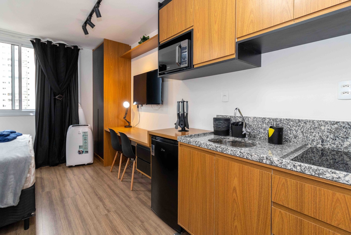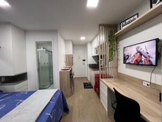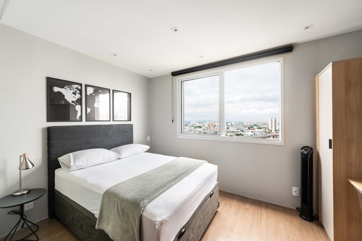 Studio bem decorado e com produtos e equipamentos de alta qualidade, trazendo bastante conforto e aconchego em sua hospedagem. O prédio está localizado no Centro de São Paulo, no Bairro do Brás, famoso pelas compras de roupas e acessórios no atacado. O local é bastante prático para quem quer acessar importantes avenidas, como Avenida do Estado e Radial Leste, e o principal: o hóspede fica a poucos passos a pé (4 minutos) da Estação de Metrô e de Trem (CPTM) do Brás.