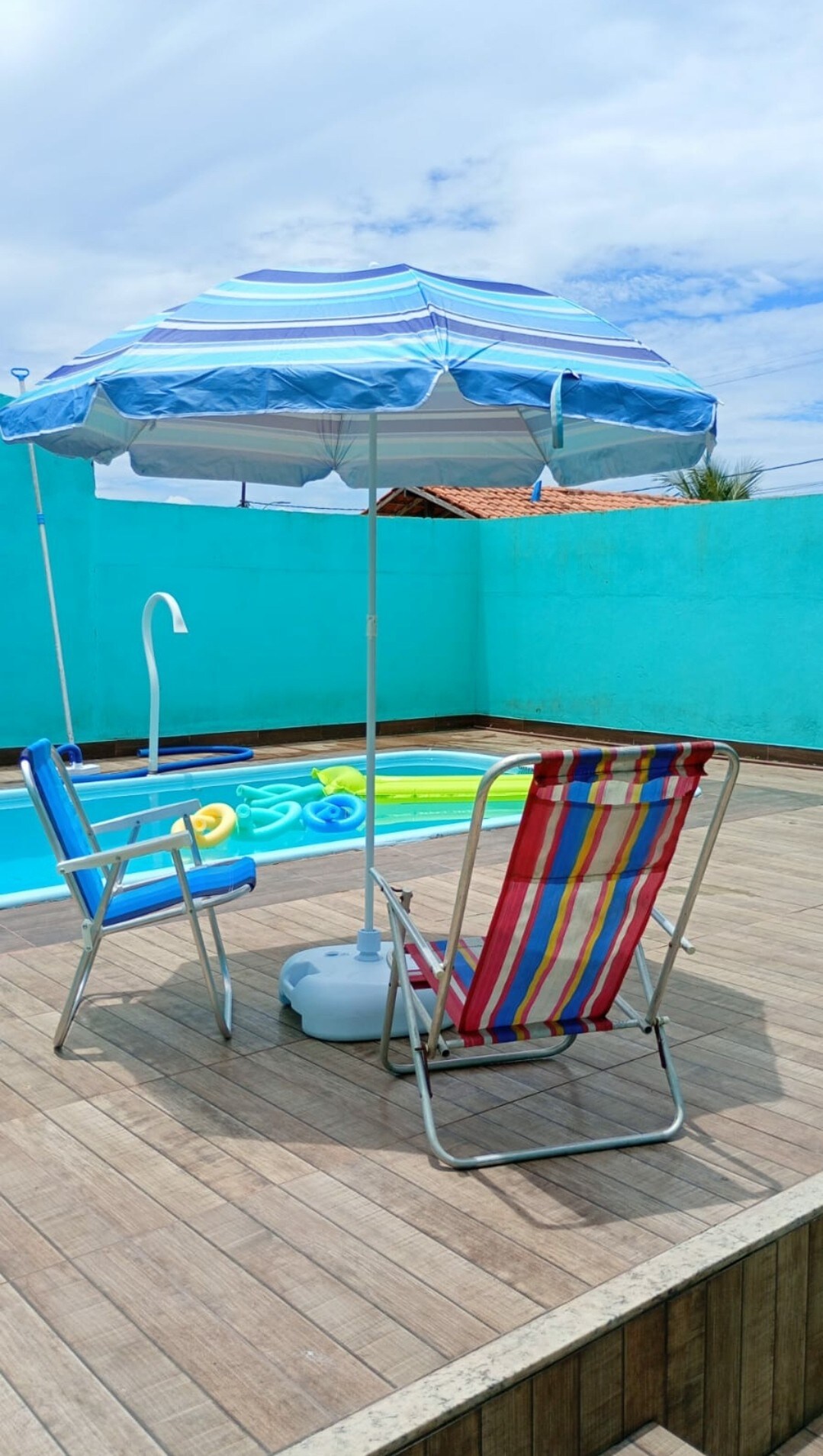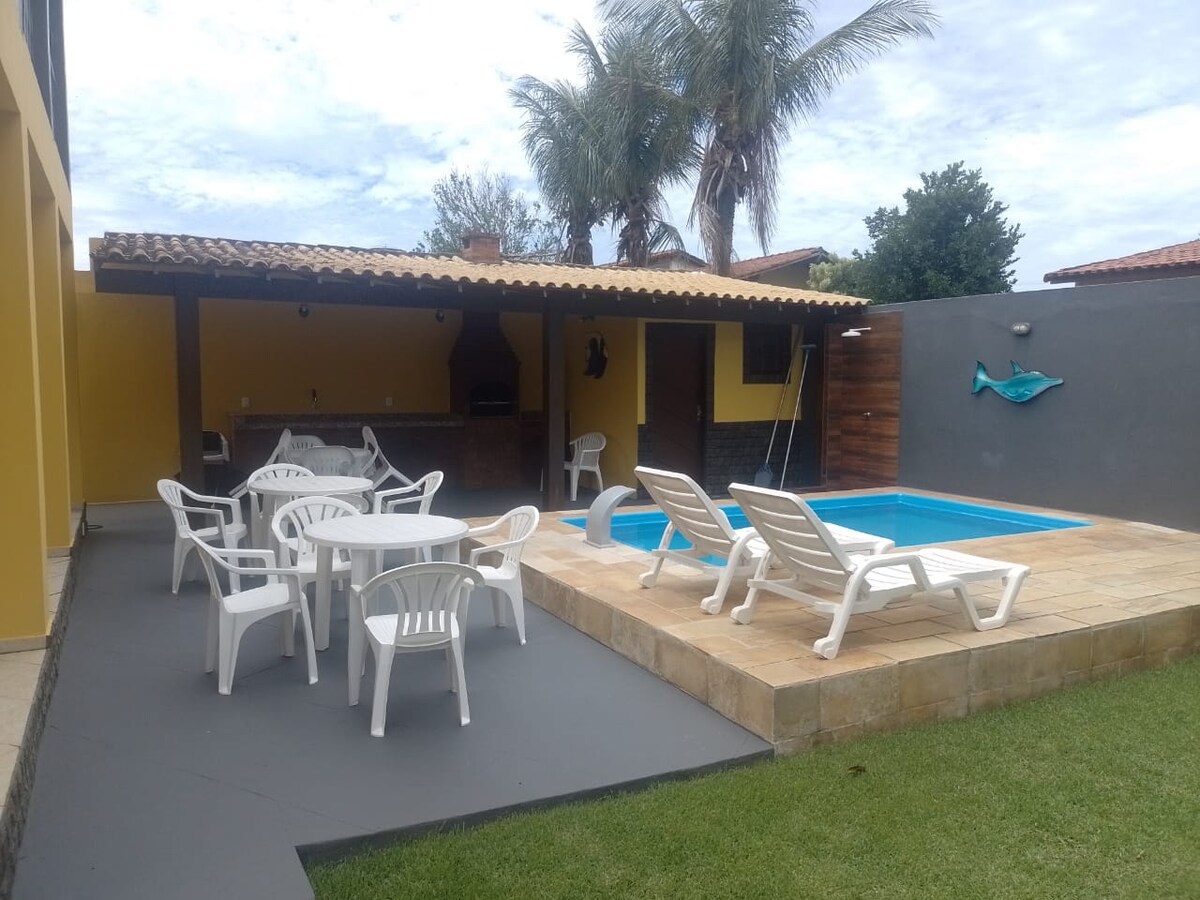 A casa tem 4 quartos, sendo 3 com AR CONDICIONADOS , portão automático, vaga pra 3 carros, conta com uma piscina de 6 mts, com uma parte para crianças pequenas com acompanhante , uma área coberta , churrasqueira com uma boa bancada e duas cubas para gelar as bebidas, mesa de sinuca e totó , dois banheiros externos (feminino e masculino ), dois banheiros internos , duas redes para descansar. Estamos a 25 km de cabofrio e 35km de arraial do cabo.