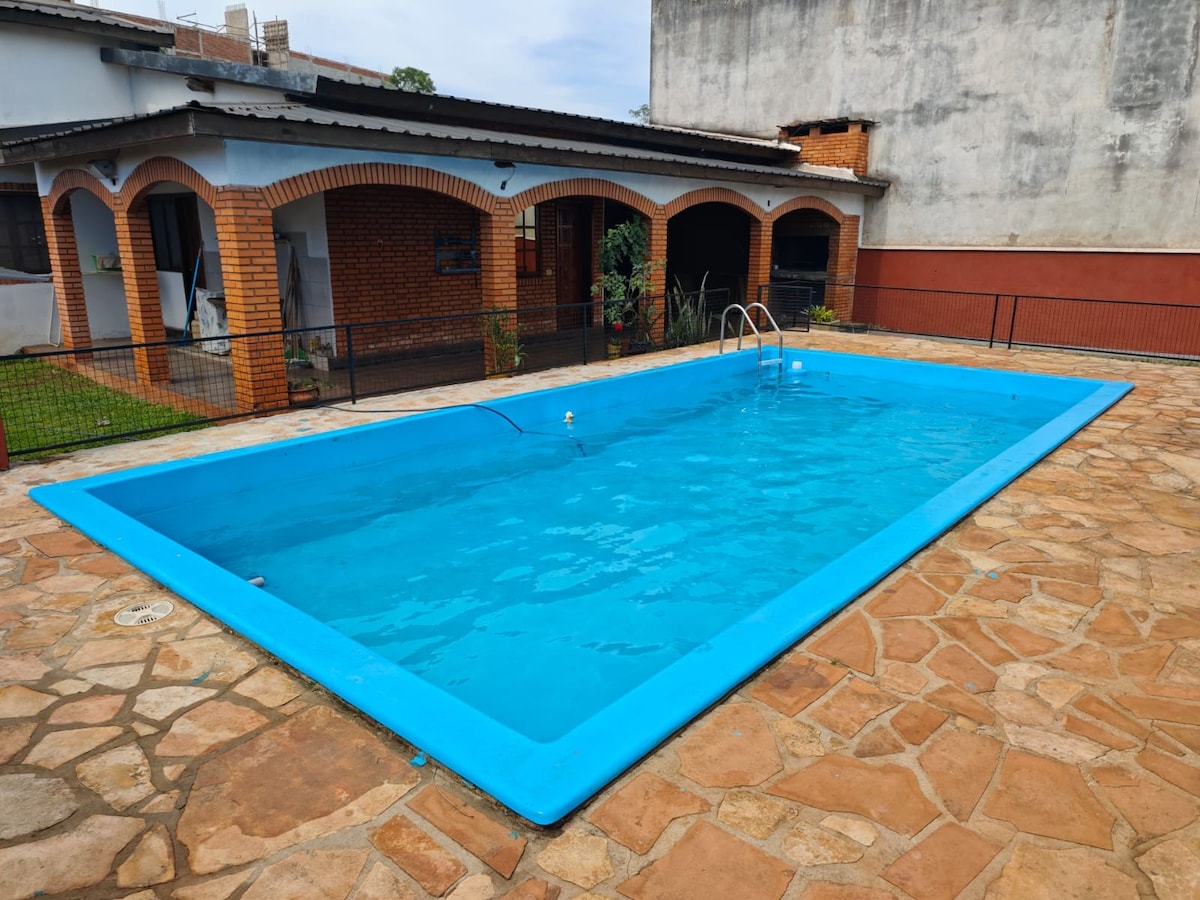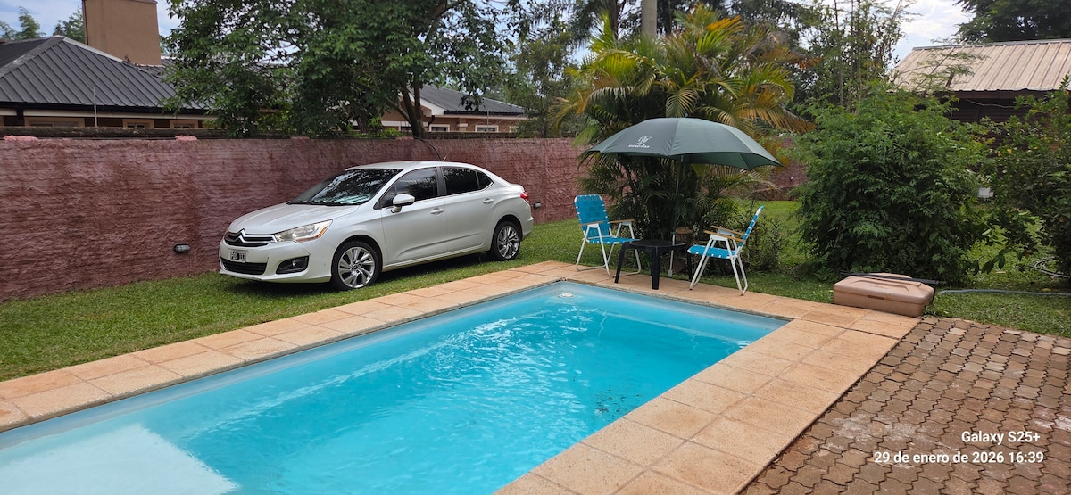 Hermosa y amplia casa, ideal para familias, parejas y grupos. Ubicada a tan solo 300 metros del centro de Puerto Iguazú, a metros de la Av. principal Victoria Aguirre donde se ubican la mayoría de las tiendas, restaurantes, farmacias y supermercados. Te va a encantar mi espacio por sus amplios espacios, su privacidad y seguridad. Es un gran lugar para descansar, compartir con familia o amigos y disfrutar del aire libre, contamos con un hermoso jardín, un patio con quincho y piscina .