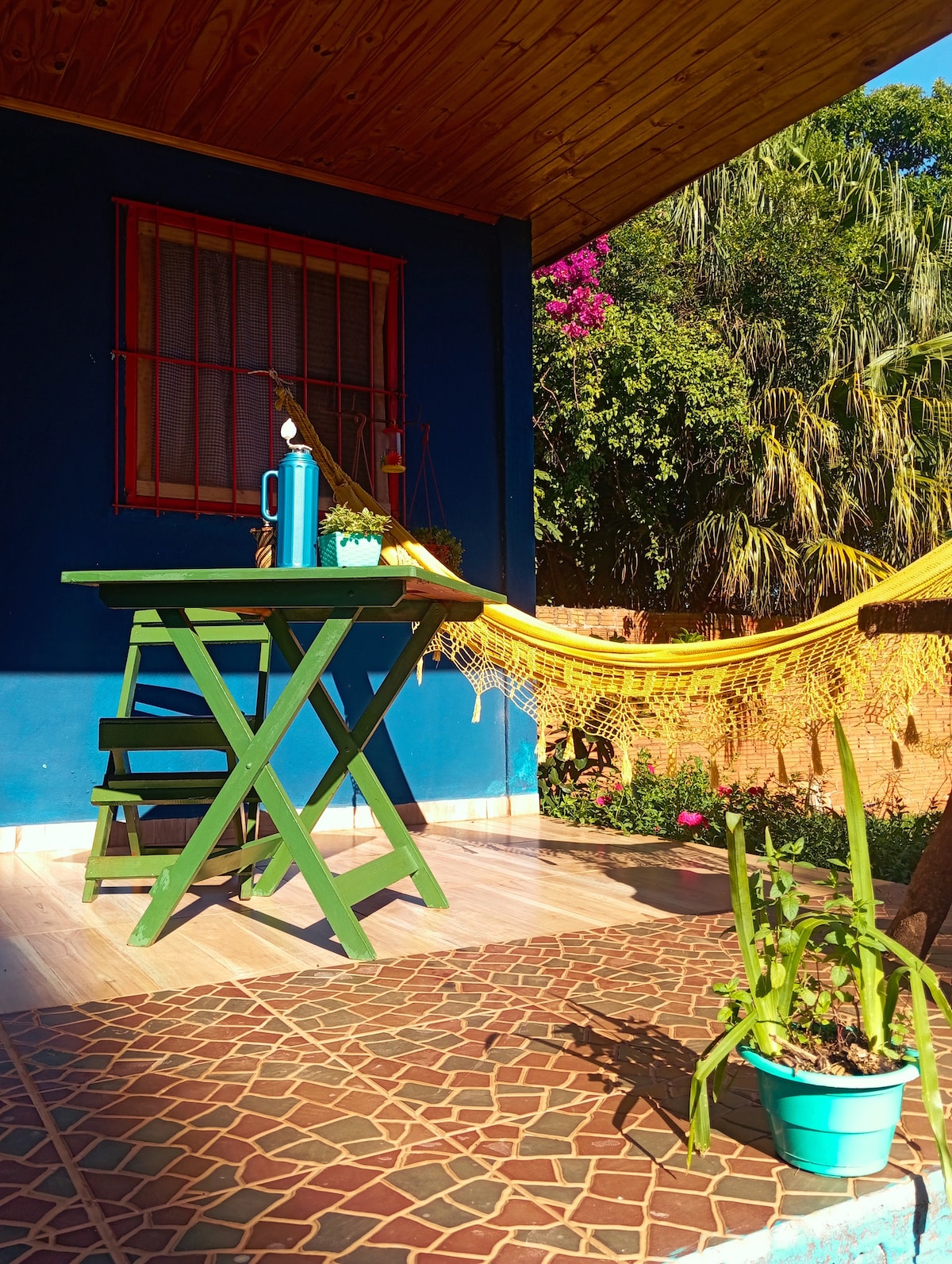 Ombú Guests House: tu hogar en Iguazú. Nuestra casa, rodeada de un jardín con plantas autóctonas y frutales, recibe a diario mariposas y pájaros. Las mascotas suman calidez al ambiente. Después de un día de excursiones, relájate en la piscina o comparte mates y asados en el quincho con parrilla. La cocina comedor es una área compartida, es amplia y está completamente equipada. Ubicación ideal: a 1.000 m de la terminal y la zona gastronómica, con comercios esenciales a 300 m.