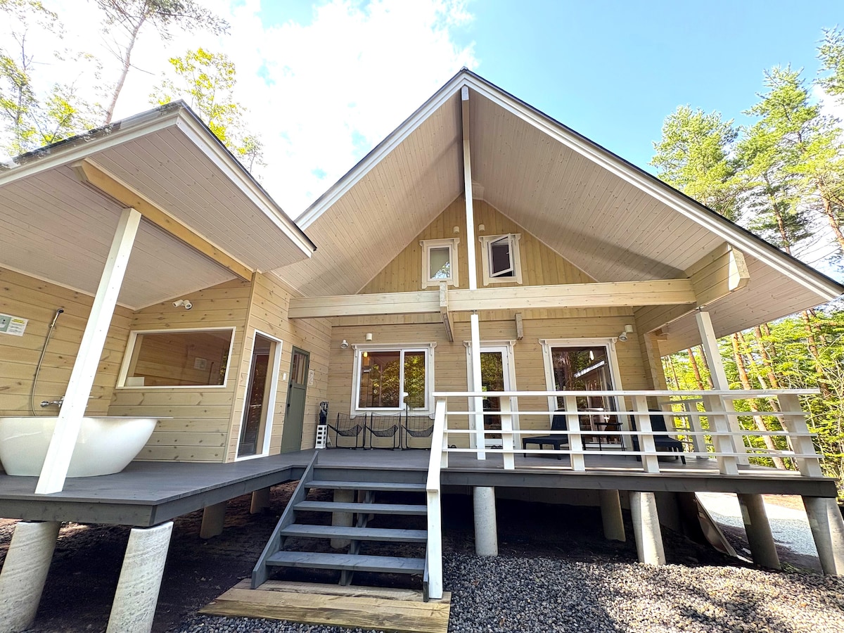 B棟 STAYCHELIN2025受賞宿 静かな100坪(敷地1500㎡)の森の庭付き丸ごと一棟貸切の新築ヴィラ。旅サラダや有吉の壁に本宿が出演しました。 広々としたヴィラで、心地よいひとときを過ごしませんか?自然豊かな森の中に建つ、一棟貸切の特別な空間です。静かなリビングでは、暖炉の心地よい暖かさが広がり、最新のAladdinプロジェクターでNETFLIXを楽しむことも。リラックスの時間は、最大7人が利用可能なサウナで体を芯から温めた後、屋外ジャグジーで涼むのがおすすめ。 広いウッドデッキテラスからは大自然を一望できます。特別な体験といえば、ガスBBQグリル(有料)を使ったアウトドアダイニング。焚き火を囲んでの語らいや、森を眺めながらの読書の時間も贅沢です。 寝心地抜群のシモンズのマットレスを使用したベッドルームは3部屋、最大収容人数は10名。さらに大規模な集まりの際は、隣接する2棟を合わせての利用も可能です。 アメニティはイタリア最大級のオーガニック認証、BALMUDAのキッチン機器や洗濯・乾燥機も完備。細部までこだわったこのヴィラで、極上のひとときをお過ごしください。