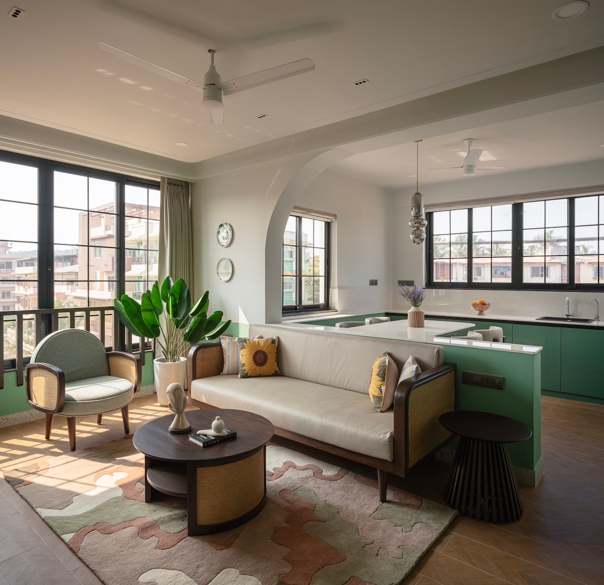 A hidden gem tucked away in Panjim's poshest zip code. Our 2BHK penthouse has a private terrace and is a short walk from Miramar beach. A Goan sanctuary surrounded by greenery; the open-plan, sprawling living room transforms into a chic space after sunset with designer ambient lighting. The famous promenade, grocery stores, and cafes are just a stroll away. Fontainhas & casinos are a short drive away. Enjoy high-speed WiFi if you’re working from home. PS: Look for peacocks in the morning!