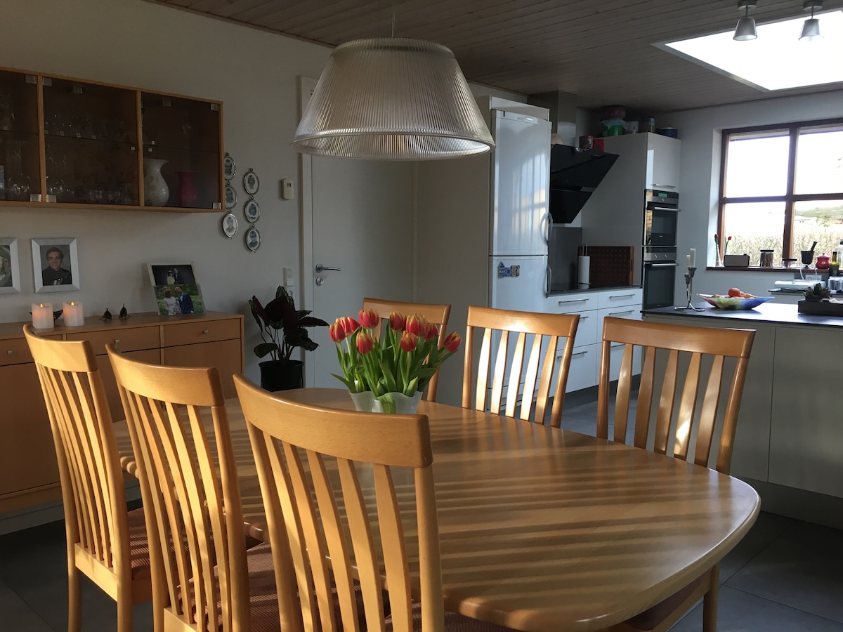 Top floor available for my guests including two bedrooms with twin beds each, and a spacious bathroom. Outdoor terrace with access from the kitchen (shared access). Shared use of kitchen facilities and living room. Only a few kilometers from Silkeborg downtown. Supermarket less than one kilometer up the hill (Rema 1000 in Funder).