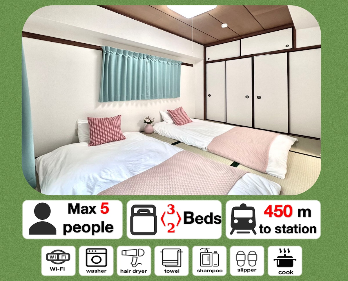 可步行至池袋的温馨小屋|交通便利|漫画圣地常盘庄旁 欢迎来到我们位于池袋附近的舒适小屋! 房间位于二楼,约20㎡,在东京属于偏大面积,适合情侣、朋友或家庭出行。 房间配有两张0.9米单人床,可合并为1张1.8米超大床,另有一张沙发床。 可免费寄存行李,方便您灵活安排行程。 一楼配有额外的25㎡休息室,24小时开放。 有电视,沙发,额外的洗手间,冰箱内有免费的饮料以及冰激凌。 所有入住房客均可免费使用。 交通超级方便: 步行7分钟大江户线(落合南长崎) 步行8分钟西武池袋线(椎名町) 步行20分钟山手线(目白) 散步25分钟可走到池袋 无需换乘 直达新宿 秋叶原 银座 代代木 六本木 麻布十番 上野 筑地市场 浅草寺等。 轻松通达东京各大热门景点。 门口50米即是公交站,池11、池65、白61、宿02、练68多条公交线路直达市内各区。 房源邻近知名的常盘庄漫画圣地,这里曾是多位日本漫画大师的起点,是漫画迷不可错过的打卡地! 还有多家米其林餐厅,让你足不出户打卡摘星! 不论是旅行、探亲还是短期居住,这里都是您在东京的理想落脚点。欢迎预订,期待与您相遇!