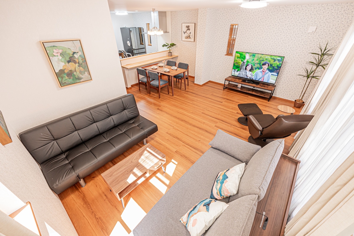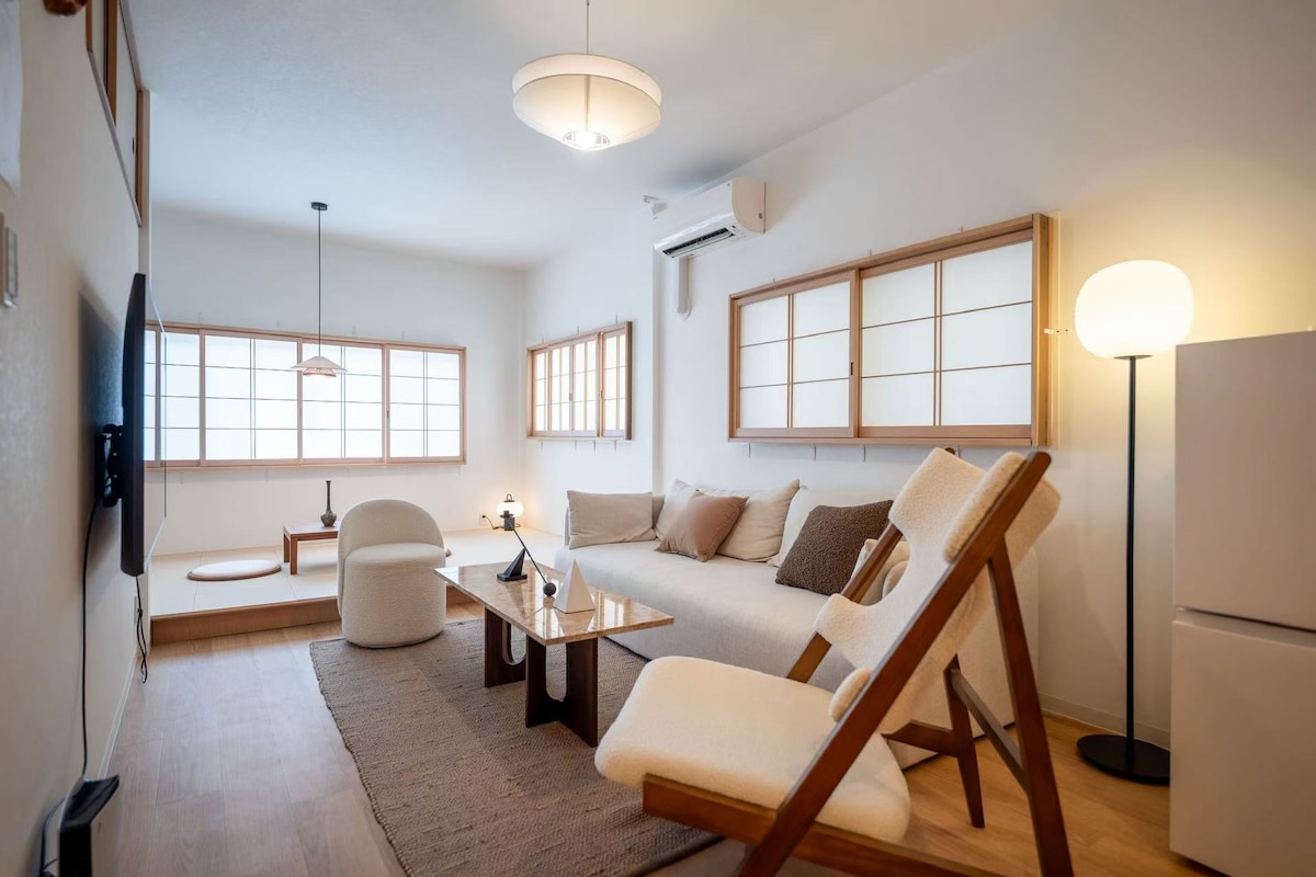Just a 2-minute walk from the station, Palette House is a cozy and stylish retreat perfect for exploring Tokyo. The industrial-style kitchen includes an island bar, full cookware, wine glasses, and a water dispenser—ideal for cooking and evening drinks. The living room features natural driftwood décor and a comfy sofa, while the Japanese-modern bedroom offers a refined, relaxing space. With thoughtful amenities and warm design, it’s a perfect base for couples and families.