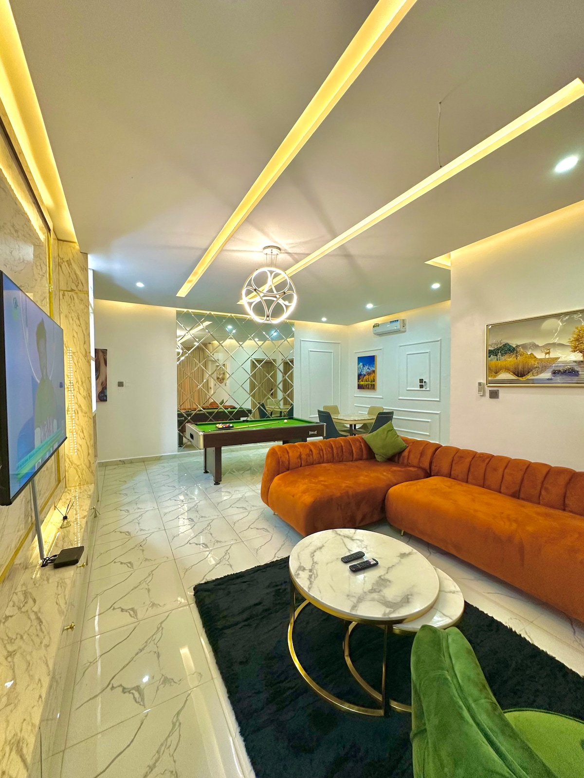 In this home, We’ve passionately created that perfect Indoor/Outdoor experience. It comes complete with a Pool, Gazebo, Laundry area and more. Inside is a living area with 65inch smart Tv and leather settees. Your bedrooms come ensuite with modern bathrooms and high water pressure. The kitchen comes with a heat extractor, and burners. Our WiFi is wired and Super fast. Power is 24/7. At your service is a Security guard and Porter.