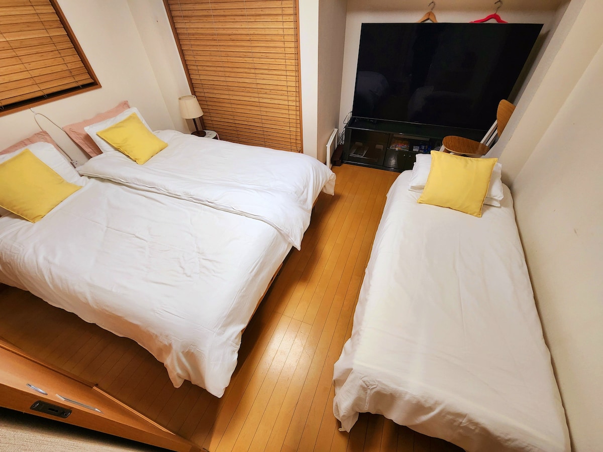 ご覧いただきありがとうございます。 三ノ宮駅から徒歩10分~15分くらいです。 65型の大画面テレビ。 メニューボタンよりYouTubeやNetflixなど視聴可能です。 シングルベッドふたつと、布団と敷き布団を用意していますので3名様まで宿泊できます。 シングルベッドふたつをくっつけています、 横200cm×縦200cmの大きなベッドです。 シングルかけ布団は1人ずつ用意します。 かけ布団カバー、まくらカバー、クッションカバー、ベッドシーツ、すべてのカバーを交換します。 バスタオル1枚、フェイスタオル1枚を用意しますが、多めに必要でしたら事前にご連絡いただくと用意します。 近くにはおいしくて居心地の良い飲食店が多数あります。 近くの喫茶店のコーヒーやモーニングなど出前できます。 【無料駐車場】 1台 何部屋か運営しており他のお客さまが止める場合は利用できません。 事前にお問い合わせください。