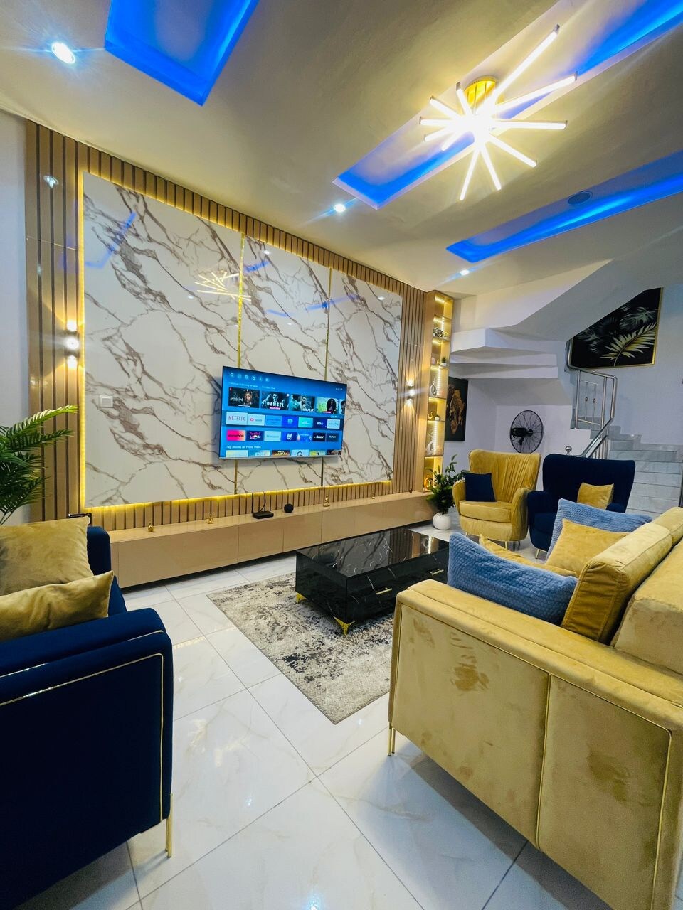 Take it easy at this unique and tranquil getaway. This elegant brand new luxury house has a style of its own. It’s situated in the heart of Lekki with 5 -star amenities. The house is situated in a 24/7 secured estate and a private house keeper to attend to your cleaning needs as needed. The house is very spacious, and comes with amenities like ; 24/7 Electricity, Shared Swimming Pool, A/C, 6 Smart TV, smartLock, Semi-Orthopedic Mattresses, DSTV & Inbuilt Speakers.