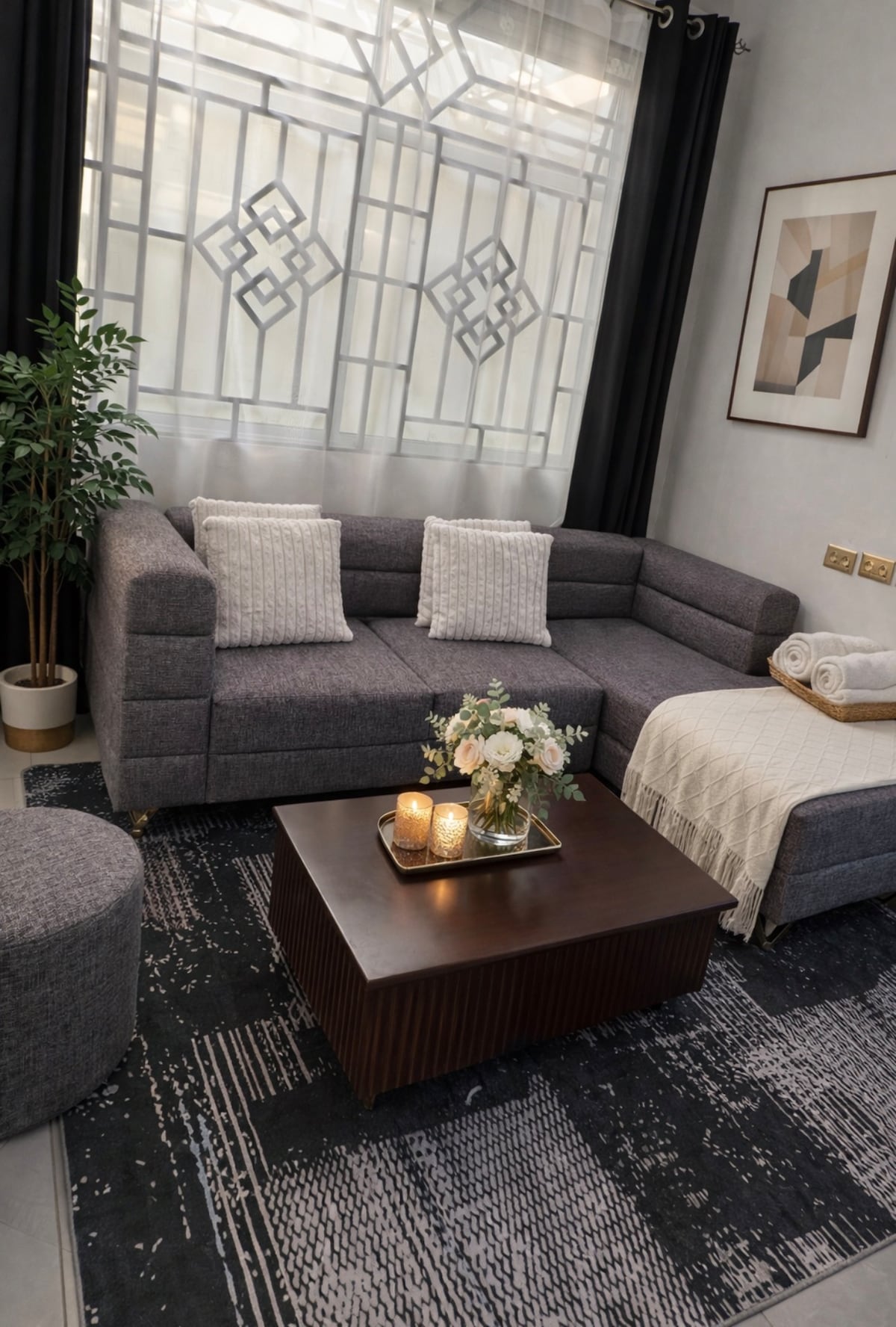 Experience modern comfort in this beautifully designed 3-bedroom apartment, perfect for families, groups, and business travelers. Every corner is thoughtfully furnished—from the cozy bedrooms with hotel-style bedding to the elegant living and dining area made for relaxing and entertaining. Soft lighting, curated artwork, premium fabrics, and neutral tones create a calming, luxurious atmosphere throughout the home.