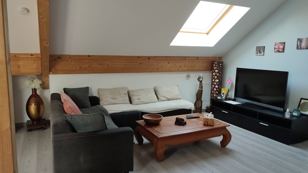 🌿 100% wood-framed, eco-friendly house. Upstairs gîte (120 m²) with private sauna and gym access. 🌞 Private 60 m² wooden terrace, large 4200 m² shared garden. 🌳 Beautiful countryside views, perfect for peaceful, rejuvenating moments. In summer, enjoy the children’s playground, campfire, and shared pétanque with family or friends. 🚗 Just 1 hour from Paris, 30 minutes from Disneyland Paris, 15 minutes from Provins. Ideal for nature lovers close to major attractions.