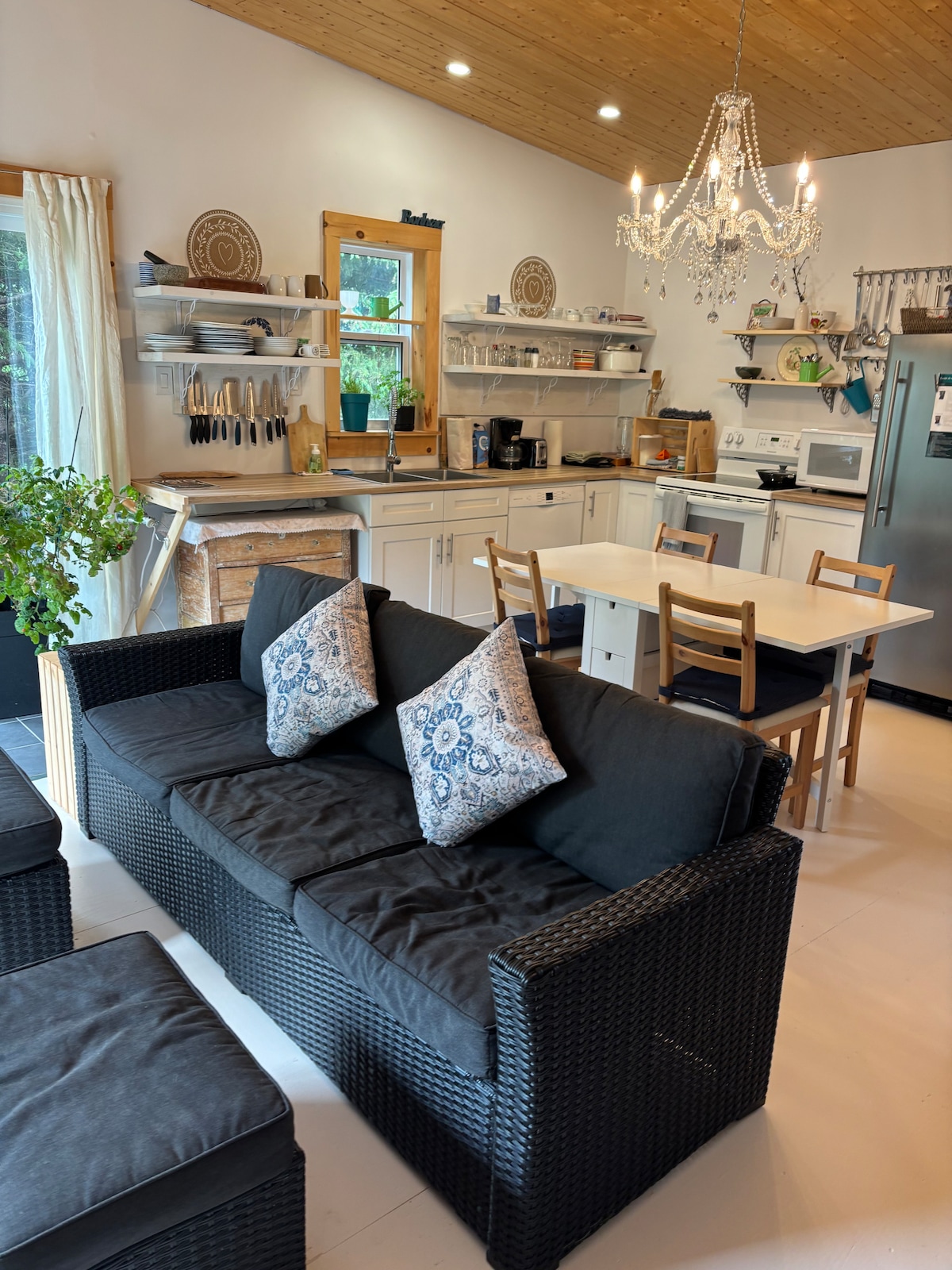 On profite de la cuisine et des commodités comme à la maison, avec une ambiance de vacances qui fait du bien! Ce chalet convivial est idéal pour la famille, il contient une chambre privée incluant un lit queen ainsi qu'une salle de bain et une aire de repos avec une divan lit. Family friendly, this cottage bosts a fully equipped kitchen, a living area with a sofa bed, a bathroom as well as a bedroom with a queen bed.