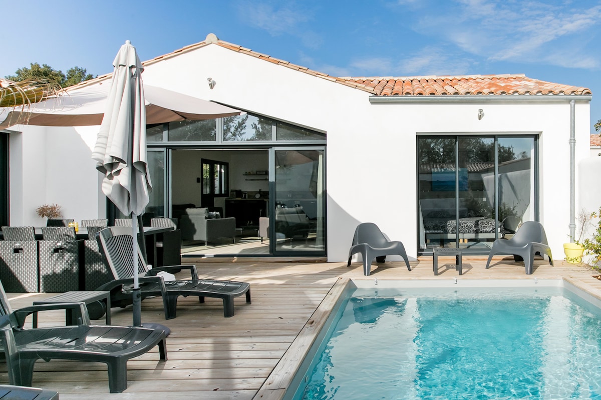 Villas Véronique, un bout de paradis sur l’Ile de Ré. Un endroit unique pour une nouvelle approche du luxe. Superbe villa avec piscine chauffée privative avec mer à 50 m. La pièce à vivre est ouverte sur l'extérieur. Une chambre avec un lit double et une literie de grande qualité communique avec le salon par l'intermédiaire d'une grande porte sculptée en bois de palissandre. La deuxième chambre possède un lit simple. La salle de bain dispose d'une douche à l'italienne en pierre naturelle.