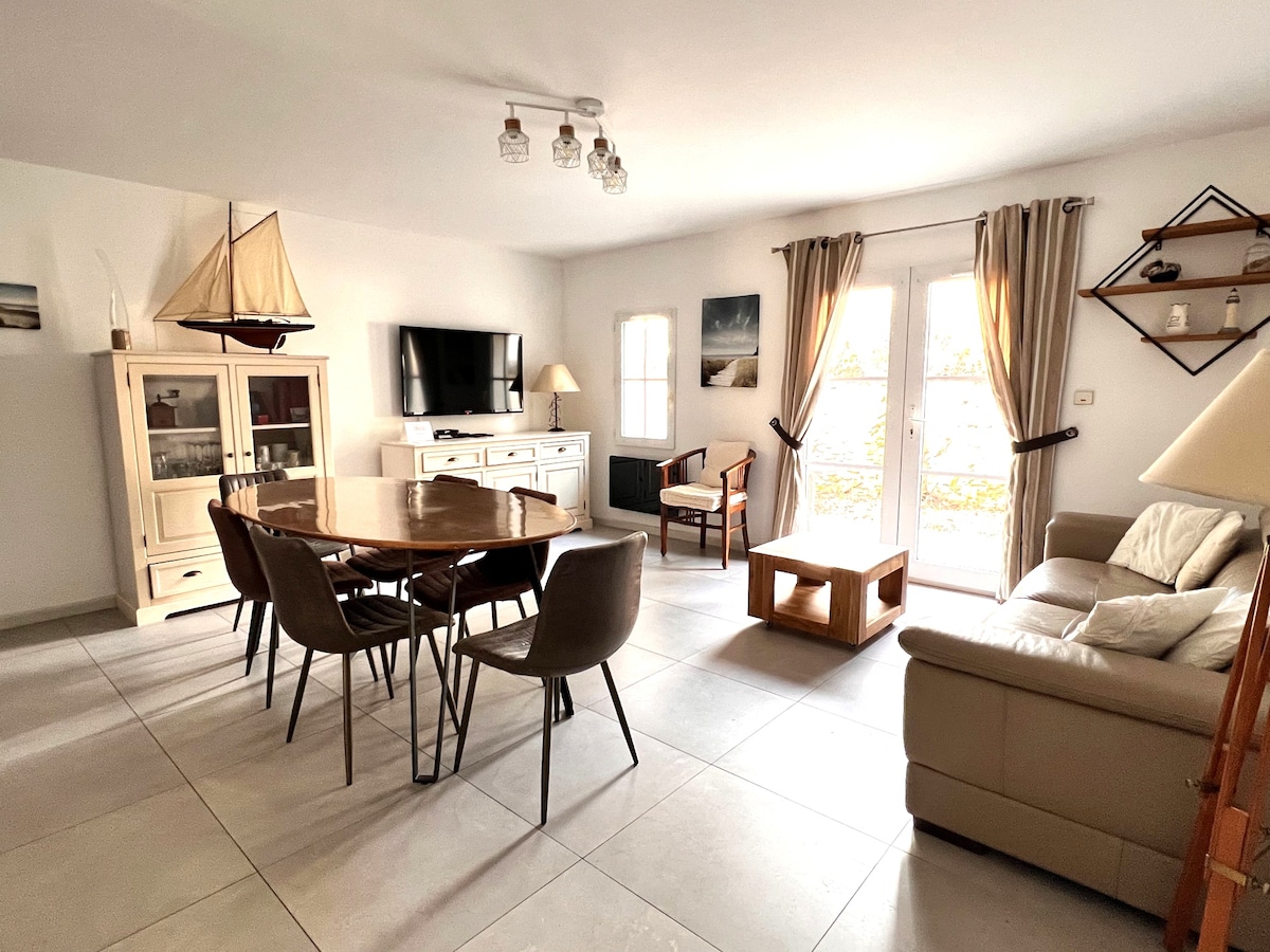 Appart de 50m2 rez de chaussée, au calme au coeur du Bois plage, au centre de l’ile de ré, à 2 mns de la plage du petit sergent. Pour 3/4 adultes et 1 enfant : 1 couple ( 1 lit 160 ) et 1 enfant dans la meme chambre (1 lit 90 ), 1/2 personne avec 1 banquette lit de 140 au salon, ( et 1 lit parapluie avec matelas , 1 chaise bébé ) , il offre tout le confort. Petite copropriété donc calme exigé . 1 PETIT CHIEN AUTORISÉ, PAS DE CHATS, MÉNAGE GRATUIT , local vélo sécurisé, WIFI
